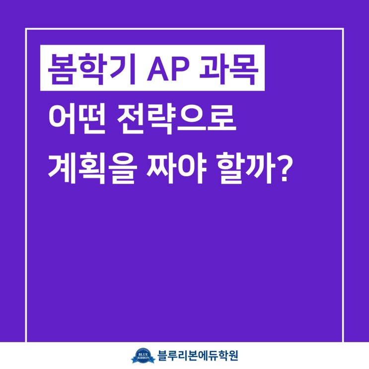 미국 대학을 준비 중인 학생이나 학부모들이 한 번쯤 겪게 되는 고민 중 하나! AP 과목 선택 및 공부 전략 어떻게 짜야 효율적인 결과를 낼 수 있을까요? 무작정 점수 맞추기 용도의 AP 과목만 선택하여 준비하는 것은 오히려 독이 될 수 있기 때문에 전공에 적합한 과목 비중을 높이면서 기초부터 차근차근 로드맵을 다질 필요가 있는데요. 특히 AP 과목 공부는 매우 오랜 시간이 소요되는 마라톤과 같기 때문에 기초부터 차근차근 AP 과목 실력을 높이면서 학년이 올라갈수록 성적 및 과목의 난이도가 함께 높아지는 우상향 곡선을 타야 안정적인 결과를 만들어낼 수 있습니다. AP 시험 공부 안정적인 준비 방법은? * 1. 무작정 듣는 건 금지 무....... <img src="https://blogthumb.pstatic.net/MjAyNjAxMDlfMjIx/MDAxNzY3OTQ4NjY5NzY0.-OYDYKFdOxTeyAYSEI2HC3OcBlAauAgKIFxaZsCAsqEg.FhJQikbyFCjbqCvoLvGORWSPOy1BBjSrlkETsxYDElsg.JPEG/260106_%BA%ED%B7%E7%B8%AE%BA%BB_%C4%AB%B5%E5%B4%BA%BD%BA_1.jpg?type=s3" />