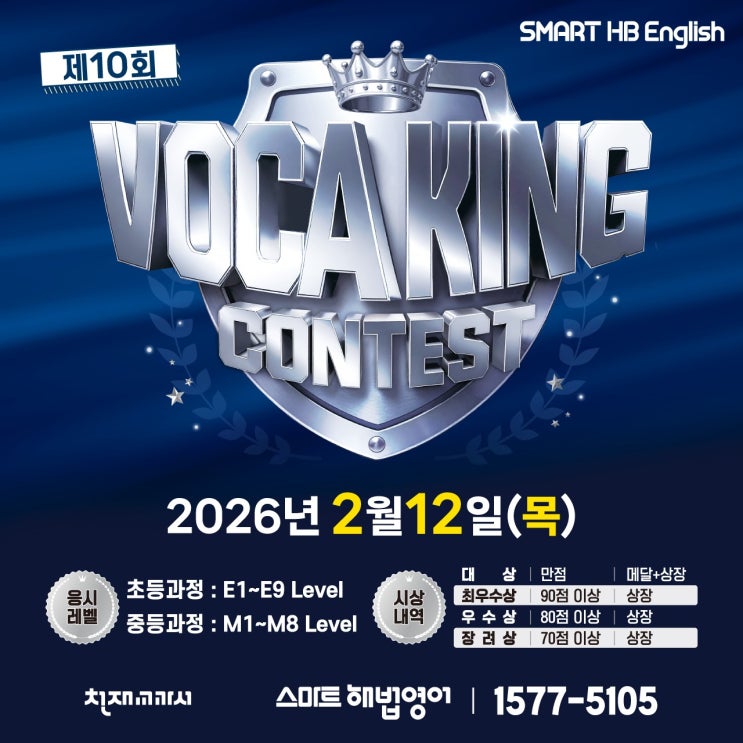 2026년 2월 12일 목요일 ! 전국 해법영어에서 시행하는 보카킹 콘테스트 준비를 시작했습니다! 우리 문학 해법이들 보카킹 콘테스트에서 그동안 갈고 닦았던 실력을 보여줄때가 온 것입니다 ! 대상은 만점을 받아야 메달과 상장을 수여받구요. (이건 비밀인데 원장쌤께서 좋은 성적을 받은 문학 해법이들에게 깜짝선물을 해주실지도 몰라요..쉿!) 저학년 학생들부터 어떻게 준비하고 있는지 살펴볼까요? 글씨는 아직 삐뚤빼뚤 하지만 한 글자 한글자씩 정성스레 써내려간 모양입니다. 처음 보는 단어들이라 초반에 외울때 틀리기도 했지만 집에가서 그 날 배운 단어들을 반복하도록 숙제도 내주니 다음날 학원에서 재시험 볼때는 다 맞는 기특한....... <img src="https://blogthumb.pstatic.net/MjAyNjAxMDlfMjgw/MDAxNzY3OTUwMTAwOTQw.BcJ3EwaMGVeBuWBY8i7vChKt5grCbY9Q4CDKseOKlpYg.gDTJGf3_5xea2RAljE2JqfyJZO1Tr4NtAu-6n11k7qcg.JPEG/KakaoTalk_20260109_181342481.jpg?type=s3" />