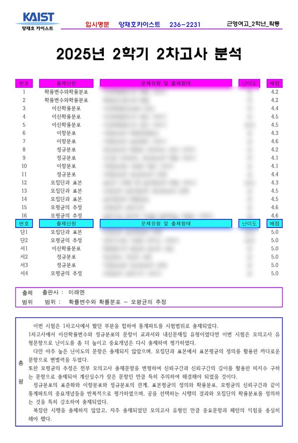 근영여고 2학년 2학기 2차고사 확률과통계분석 전주 중★고등수학 상위권의 표본인 전주 수학학원 양재호카이스트학원입니다. 이번에는 전주 근영여고 2학년의 확률과통계, 2025년 2학기 2차고사를 분석하여 보겠습니다. 위의 내용 중 난이도는 양재호카이스트학원의 내부자료입니다. 그런 이유로 블로그에서는 모두 공개할 수 없음을 양해바랍니다. 학원에 내원하시면 열람가능합니다. ^^ 중화산동 수학학원 양재호카이스트학원에서는 전주에 있는 중★고등학교의 기출을 항상 분석하고 기록으로 남기고 있습니다. 아직 시험을 보지 않은 학생들에게는 좋은 자료가 되고 도한 내년, 내후년에 후배들에게 많은 도움이 되기도 해서입니다. 그리고....... <img src="https://blogthumb.pstatic.net/MjAyNjAyMjJfMjIw/MDAxNzcxNzUzMjkxNzI2.DJxhmGAmZ5Eiwnm1K5JZ6N2wKT0hgtAcgasRPajZYtUg.5-fgF0r2vtvhL789t07NyNcy8k9brSHMF5TvzOGZ9nsg.JPEG/2025-2%C7%D0%B1%E2_2%C2%F7-%B0%ED2-%B1%D9%BF%B5%BF%A9%B0%ED-%C8%AE%C5%EB.jpg?type=s3" />