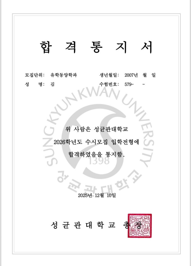 오랜만에 글을 올립니다. 중학교 2학년 부터 수능 전날까지 저희 캐나다이레 학원에서 수업 받은 학원생의 성균관대 합격소식이 오늘 전해졌습니다. 더불어 얼마전 서울대 1차 합격하고 면접을 보고 내일 결과를 기다리고 있습니다. 저희 학원에 처음 왔을땐 중학교 영어 기초가 거의 없는 상태였으나 많은 훈련과 학습끝에 결국 중3때 영어 100점으로 중학교를 마치고 고등학교 내신을 1~2등급을 줄곧 유지하였고 이번 불수능에서도 영어로 최저를 충족하여 좋은 결과를 얻게 되었습니다. 그동안 학원에서 학습한 내용과 학생의 학원 후기를 다시 올리고 다른 학원생의 합격소식도 함께 다시 전하도록 하겠습니다. 추가 합격소식이 전해져 합격....... <img src="https://blogthumb.pstatic.net/MjAyNTEyMTBfMTI1/MDAxNzY1MzQ2Nzk3MDY0.n54jpYOJhQh-tRu7Uo8gTwq0YCremRPYXJm7yCH1tz0g.BQPHGgahcIkeqbOK1YJbDVmpuSWk1RhN_NQYbD6wXM0g.JPEG/KakaoTalk_20251210_150610694.jpg?type=s3" />