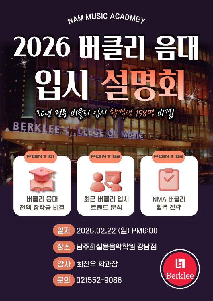 안녕하세요 :) 남주희 실용음악 학원입니다. 지난 2월 22일 (일) 남주희 실용음악학원 강남점에선 버클리 음대 입시설명회가 진행되었는데요! 굉장히 많은 학부모님, 학생들이 자리에 참석해 주셨고 또한 이번 버클리 음대 입시설명회는 Zoom 링크를 통해 많은 분들께서 온라인으로 참석해 주셨습니다. 이번 버클리 음대 입시설명회는 오랜 시간 동안 NMA 버클리반을 담당해 주시고 계신 최진우 학과장님께서 진행하셨는데요 버클리 음대 소개를 시작으로 온라인, 오프라인 오디션 설명 오디션을 치르는 과정 실기 이외에 필요한 학업, 영어실력 관련 정보 남뮤직 버클리반 장학금 획득 학생 소개 남뮤직 만의 오디션 전략 들을 직접 설명해 주셨....... <img src="https://blogthumb.pstatic.net/MjAyNjAyMjNfMTQ4/MDAxNzcxODI3NjY3ODI0.fcbMmxMpA_nP-6etfxS7HVaqZ8K-9_WOVv8fXdj97eMg._1qP8tz4W5QV35EkWQ9OrbwQfSnXgm3Q2ETOD7_KT5Yg.JPEG/2%BF%F9_%B9%F6%C5%AC%B8%AE_%C0%D4%BD%C3%BC%B3%B8%ED%C8%B8.jpg?type=s3" />