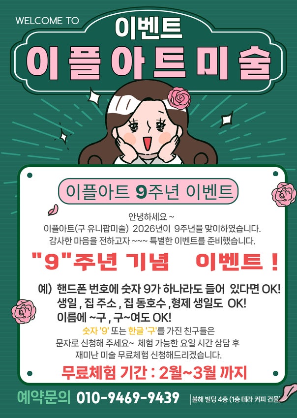 안녕하세요~ 올해는 이플아트(구 유니팝미술 마곡)이 9주년을 맞이하는 해 입니다~ 시간이 정말 ~~ 정말 빨라요 ~ 그래서 ~ 뭔가 안하고 지나가면 재미가 없을 듯해서 저만의 이벤트를 준비해 보았습니다. 학생관 관련된 숫자 9 또는 한글 구 가 들어간 친구들은 누구나 무료 체험 신청이 가능하세요 ~ 예로 핸드폰 번호에 숫자 9가 들어가 있거나 생일 집 주고 ~ 동,호수 형제 생일 또는 이름에 ~구 , 구~ ,구~~ 이라고 들어가 있는 친구들은 누구나 체험 신청이 가능하세요~ 평상시 이플아트를 체험해 보고 싶었던 친구들은 주저 말고 ~ 특히 9~ 친구들은 모두 모여주세요! 상담 전화 02.2663.9439 010.9469.9439 문자로 아이 이름 ,나이 먼저....... <img src="https://blogthumb.pstatic.net/MjAyNjAyMDlfMTcx/MDAxNzcwNjE4MzM0NzE4.eJwl-TR0iGhdDd3_kdlt0nijvZ_NW3EtPxIXpuy7KAsg.IiQnhTBXxzLfx4MxKe7zcMN9MVZwtIcCLw7u_xEPJaMg.JPEG/9%C1%D6%B3%E2%C0%CC%BA%A5%C6%AE.jpg?type=s3" />