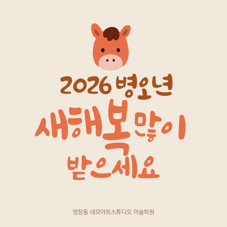 안녕하세요! 염창동 미술학원 네모아트스튜디오입니다 어느 덧 2026년 새로운 시작을 알리는 설 명절이 다가왔어요. 지난 한 해 동안 네모아트를 믿고 함께해 주셔서 감사합니다. 설 연휴 기간 동안 학원 운영 일정은 아래와 같습니다. 2026년 2월 16일(월) - 18일(수) 까지는 설 연휴이기 때문에 수업이 없습니다. 2월 19일(목), 20일(금)에는 오전 특강 수업만 없습니다. 2월 19일 1시 이후 정상 수업 재개 정규반 수업은 정상 운영하니 참고해주세요 설 연휴 동안 문의는 연휴 이후 순차적으로 답변 드리겠습니다. 새해에는 아이들이 더 즐겁게 그림 그리고 한층 더 성장할 수 있는 수업으로 보답드리겠습니다. 설 연휴동안 가....... <img src="https://blogthumb.pstatic.net/MjAyNjAyMTBfNjYg/MDAxNzcwNjk0OTczMDQ0.EvQiA2N52M723KTzyxmjvvTz4SNm6E64elsQqisFb78g.4CNIx7LSgM8ghjEi7OknzlosGTQ7_EKs30lSMlUMZqwg.PNG/%BF%B0%C3%A2%B5%BF_%B9%CC%BC%FA%C7%D0%BF%F8_%BB%F5%C7%D8_%C0%CE%BB%E7.png?type=s3" />