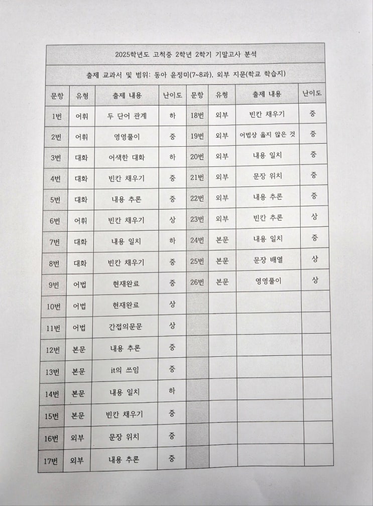 안녕하세요. 비상잉글리시아이입니다. 지난 월요일은 고척중학교 2학년 기말고사가 있었습니다. 시험지 분석은 다음과 같습니다. 이번 2025년 고척중 2학년 2학기 영어 기말고사는 교과서(동아 윤정미 7~8과)와 외부지문(학교 학습지) 중심으로 출제되었으며, 단순 암기 보다는 유형별 이해력과 적용 능력이 요구되는 시험이 있습니다. 어휘/어법/대화/본문/외부지문 까지 고르게 출제되었으며, 고척중은 외부지문이 시험 범위에 들어가는 학교인데, 특히 이번 기말은 외부지문의 비중이 컸습니다. 외부지문(16~23번)과 본문 고난도 문항(25~26)번에서 변별력이 발생하였을꺼라고 생각합니다. 또한 단순히 교과서만 외운 학생과 유형별 문제풀이....... <img src="https://blogthumb.pstatic.net/MjAyNTEyMTZfMTIw/MDAxNzY1ODY5MzE5ODU1.nEvN-JhvMM6yvLGI1263jAqYUoOMRW5HSxkEYM2S18Mg.-t7DYgyMKc6ibsao9JhhVcI0K2DlblhiYw16Pc6gv6wg.JPEG/KakaoTalk_20251216_160807254.jpg?type=s3" />