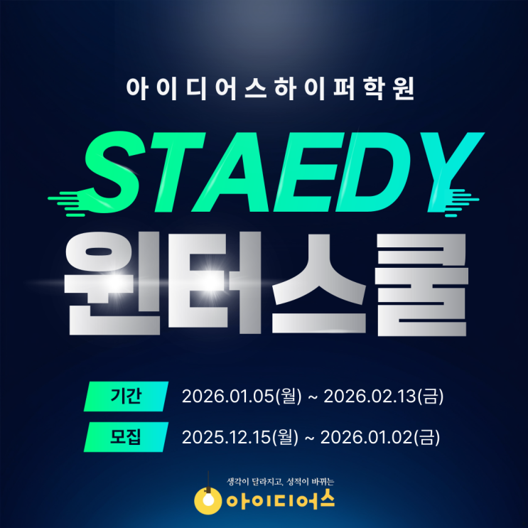 36주의 기적! 아이디어스만의 공부 근육 만들기 프로젝트! ▶ 2026년 01월 05일 (월) 부터 02월 13일 (금) 까지 (총 6주) ▶ 밀착형 관리를 위해 총 22명으로 한정! ▶ 고등 국어+수학+영어+통합과학 완공반 & 관리형 자습 : ● 오전 09시부터 오후 17시까지 : 관리형 자습 + 매주 목요일 오전 국어+수학+영어 윈터스쿨 모의고사 시행 (결과 및 리포트 안내) ● 오후 : 월요일부터 금요일까지 국어/ 수학/ 영어/ 통합과학 선택 수강 ● 토요일 : 오전 10시부터 오후 17시까지 자율형 자습 (선택) ▶ 학원 수업, 과외, 학교 일정에 따른 외출 가능 (단, 반드시 사전에 학원 및 학부모 허락 필요) ▶ 우신고, 오류고 상위권 출신의 학습 관리 조....... <img src="https://blogthumb.pstatic.net/MjAyNTEyMTZfNTAg/MDAxNzY1ODUyNzA4NjA1.K03hLnoWekcal4cOgvJm_kgsQzSo2t4utb_WgPRRm6Mg.T-EmqplZ6sYV5BgVQJQ7NX5kTI01KTLnh0MohllNrX4g.PNG/%BE%C6%C0%CC%B5%F0%BE%EE%BD%BA%C7%CF%C0%CC%C6%DB_%C0%A9%C5%CD%BD%BA%C4%F0.png?type=s3" />
