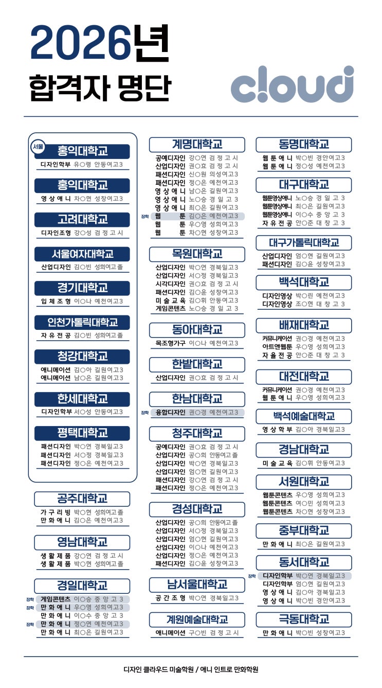 안녕하세요!! 안동 옥동 미술학원 클라우드 (디자인) / 인트로 (만화·애니) 입니다~ 모두들 설 연휴 잘 보내셨나요~? 이제 수시와 정시 모두 끝났는데요, 먼저 한 해동안 고생한 학생들 모두 수고 많았습니다~!! 오늘은 이번 2026년 입시, 단 한해, 합격자 명단을 가져왔답니다! 정시와 수시를 모두 합친 결과이며, 안동 클라우드 미술학원에서 직접 배우고, 원서지원부터 실기 끝까지 함께 달려준 정직한 합격 명단이랍니다~!! 열심히 가르쳐주신 선생님들과 믿고 따라와준 학생들 덕분에 좋은 결과를 얻을 수 있었던 것 같습니다!! 2027년도 입시도 좋은 결과가 있도록 선생님들과 학생들 모두 힘내봅시다~! 다들 화이팅!! <img src="https://blogthumb.pstatic.net/MjAyNjAyMjFfMjM3/MDAxNzcxNjQ0MTY5NTM5.lLaQhgIaXVQvgFtuDz2xGUsqKB3ZZudCqezN_dzLPX0g.W_vAinbMbBrGiU3XCkLf_j8pPq_9CpHzKeCRvCrRpqkg.JPEG/%B4%EB%C1%F6_1_%BB%E7%BA%BB_8.jpg?type=s3" />