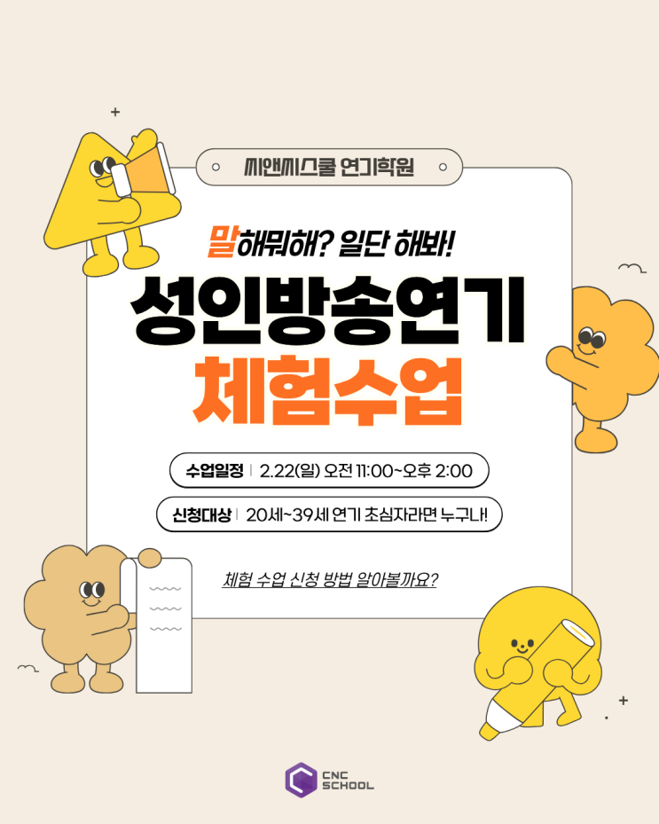 배우 연기자 되는 법, '방송연기 무료체험수업' 신청하세요! 연기는 어디서 배워야 할까? 배우가 꿈인데... 나도 영화&드라마&광고에 캐스팅 되고 싶다! 누구나 가슴 설레게 만드는 인생 작품 하나쯤은 있기 마련입니다. 작품 속 캐릭터에 몰입하다 보면 배우들의 열연에 감탄하게 되고, 자연스럽게 배우라는 직업에 대한 동경심이 생기기도 하죠. 지금 이 순간에도 꿈을 위해 정진하는 배우 지망생분들의 열정은 언제나 빛이 납니다. 하지만 막상 연기에 도전하려니 무엇부터 준비해야 할지 고민되실 거예요. 가장 중요한 건 연기의 즐거움을 직접 체감하며 본인의 적성을 파악하는 것입니다. 씨앤씨스쿨 연기학원은 배우의 길....... <img src="https://blogthumb.pstatic.net/MjAyNjAyMTNfMjcz/MDAxNzcwOTY4MDUxNDY3.DsDziPEtznBr1fu-UFUS1d9fea90N2lLIHt4DkLvmqog.Wvtg0mbF9XRfzUz49pq3XES-Tkzk7TdOcHq-xNZbWG4g.PNG/1.png?type=s3" />