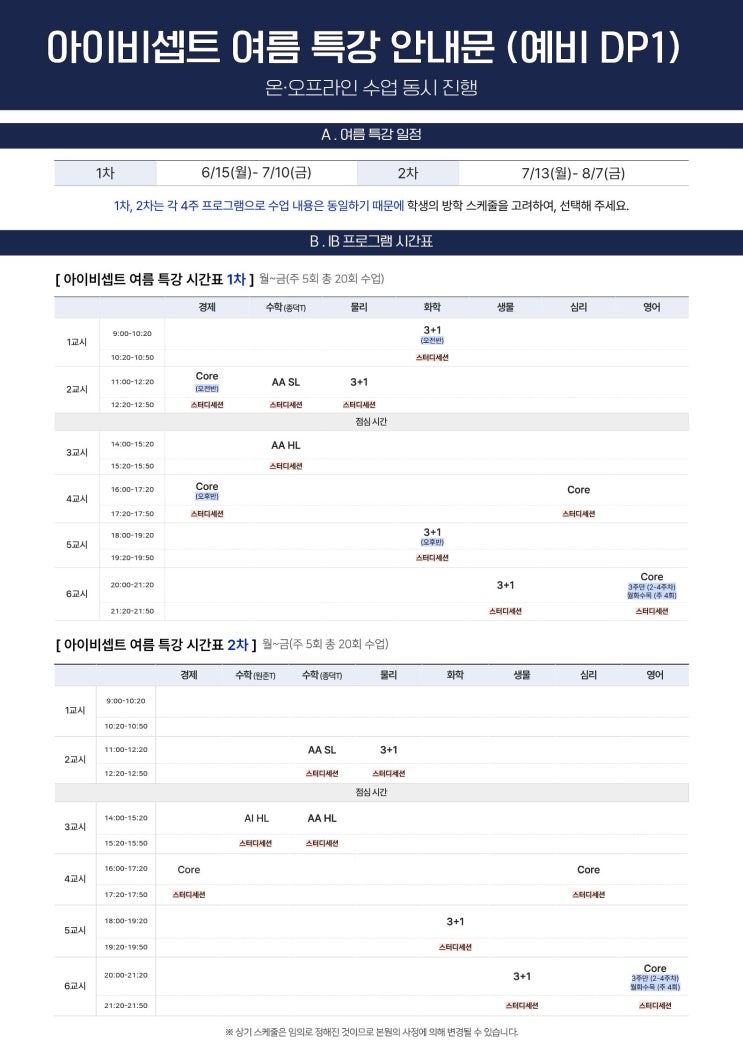 안녕하세요, 아이비셉트 학원입니다! 많은 문의가 있었던 2026 여름특강 스케줄과 수업 구성을 안내드립니다. 특강 안내문 목차 1️⃣특강 스케줄 2️⃣여름 특강 핵심 포인트 3️⃣특강 강사진이 진행하는 무료 공개 강의 4️⃣후기글 특강 스케줄 기간 1차: 6월 15일(월) ~ 7월 10일(금) 2차: 7월 13일(월) ~ 8월 7일(금) *1차,2차는 각 4주 프로그램으로 수업 내용은 동일하기 때문에 학생의 방학 스케줄을 고려하여 선택해 주세요. 장소 압구정 본점 / 온라인 (송도 캠퍼스 방학 중 휴원) 과목 경제, 영어(온라인only), 수학, 물리, 화학, 생물, 심리 ✨ 혜택 1️⃣ 선착순 50명 5% 할인 2️⃣ 3/18 [IB 전략 설명회] 참여 시 추....... <img src="https://blogthumb.pstatic.net/MjAyNjAyMTlfMTU4/MDAxNzcxNDk4ODU0Njgw.p95cc6buTvUg_XkCQeSmAid4JSuuK2b7NkGMaHjZligg.jGw7VQFZs9MSv9QLwE6bB551Q8MNCR9JeHvQMVu_9G4g.JPEG/%BF%A9%B8%A7%C6%AF%B0%AD_%BD%C3%B0%A3%C7%A5%28DP1%29.jpg?type=s3" />