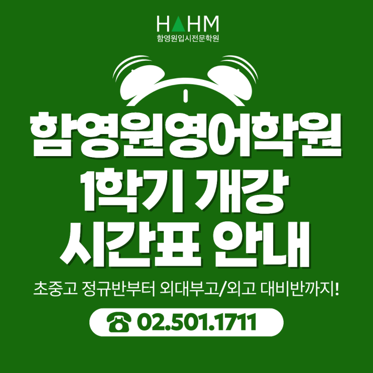 어느덧 겨울 방학을 마무리하고 새로운 시작을 알리는 3월이 다가오고 있습니다. 새 학기를 앞둔 이 시점은 아이들의 학습 방향을 점검하고 실전 감각을 끌어올려야 하는 매우 중요한 시기입니다. 최근 3월 개강을 앞두고 레벨테스트 신청이 부쩍 급증하고 있습니다. 저희 함영원영어에도 많은 학부모님께서 상담과 테스트를 위해 내원해 주고 계시며, 아이들의 뜨거운 학습 열기를 현장에서 직접 느끼고 있습니다. 학부모님들의 기대에 부응하고자, 3월부터 새롭게 운영될 함영원영어의 전체 시간표를 안내드립니다. 3월 학기 학년별 커리큘럼 요약 초등부 (초5~6) 영문법의 기초를 다지는 기초반부터, 외대부고 입시를 일찍부터 준비하는....... <img src="https://blogthumb.pstatic.net/MjAyNjAyMjBfMzUg/MDAxNzcxNTg4NDM3ODg0.61i-RWMvE9EfYkaqdghdfeyQxFR5oL9x6jfblYPVHwog.90tK8iuKFWjdR9n015zvSQjk_NRNV6wiMAIFgBZHGmcg.PNG/%B0%B3%B0%AD_%281%29.png?type=s3" />