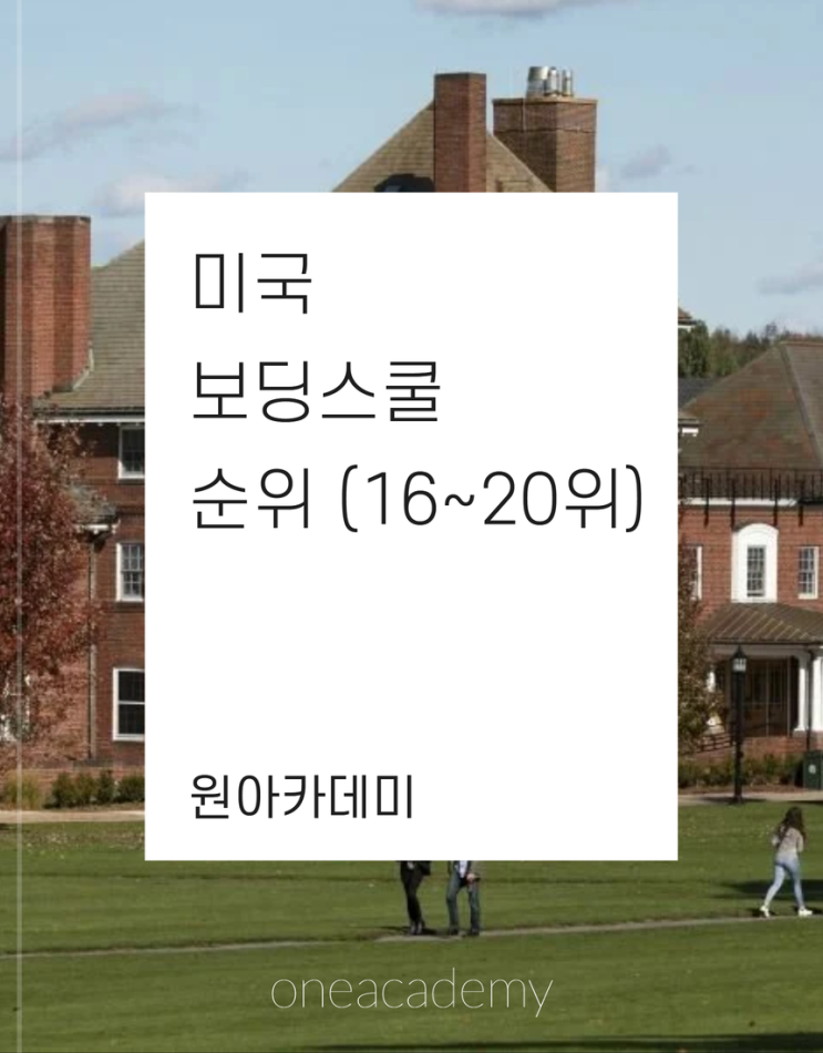 미국 보딩스쿨 순위 (16~20위) by. 압구정 원아카데미 (02-501-5590) 안녕하세요, 보딩스쿨 · 미국대학 전문 압구정 원아카데미 입니다. 오늘의 글에서는, 2026년 Niche 랭킹 기준 미국 보딩스쿨 종합 순위를 안내드리려고 합니다. 이번 글에서는 16~20위까지의 학교들을 먼저 소개하고, 다음 글에서는 21~25위의 학교들을 안내드릴 예정입니다. 보딩스쿨 랭킹은 평가 기관과 기준, 그리고 연도에 따라 비교적 유동적으로 변동되기 때문에, 순위 자체를 절대적인 기준으로 받아들이기보다는 각 학교가 지닌 교육 환경과 고유한 색깔을 이해하는 참고 자료로 활용하시는 것이 바람직합니다. 그럼 아래에서 학교별로 하나씩 살펴보겠습니다. 16위: ....... <img src="https://blogthumb.pstatic.net/MjAyNjAyMDVfNTgg/MDAxNzcwMjkxMjYyNDg5.odIXT4_CXi79iNdzhf7-HRkQGrRTWvrJ640AVbD3vycg.E4nTihv4JWFYrRrkijB7XRMBSskW4Xf7J5homk7nJrEg.PNG/%BA%F1%B1%B3%B0%FA_%C8%B0%B5%BF_%2811%29.png?type=s3" />