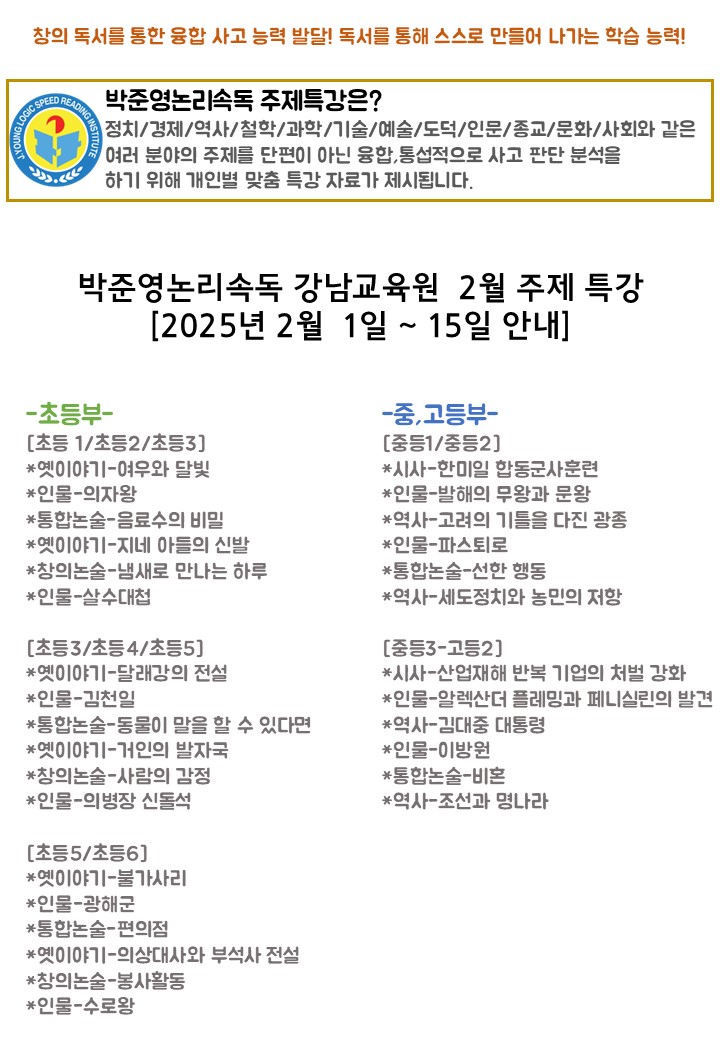 안녕하세요. 박준영논리속독 강남(일원)교육원입니다. 2월의 주제 특강을 통해 우리 학생들이 비문학/문학적 소양을 키우며 자기주도학습을 통해 스스로의 공부방법을 만들어내는 수업이 진행됩니다. 운동을 하여 체력을 키우는 것처럼 주제 특강 프로그램으로 공부에 자신감 넘치는 공부 체력을 키워나갑니다. 박준영논리속독은 정치/경제/역사/철학/과학/기술/예술/도덕/인문/종교/문화/사회와 같은 여러 분야의 주제를 단편이 아닌 융합,통섭적으로 사고 판단 분석을 하기 위해 학습별 맞춤 특강 자료가 제시됩니다. NIE, 논리정독, 논리사고와 같은 주제 논술을 통해 선생님과 함께 즐겁게 학습하고 있습니다. [시사 - 산업재해 반복 기업의....... <img src="https://blogthumb.pstatic.net/MjAyNjAyMDZfMjUz/MDAxNzcwMzc5MzY4OTI1.Hc80z309BJFvpnfQTOb4GXtvV8yCbmxNRTJ4KR5SvCIg.Ajw6BUeJTiao1dyTVRLQX2WAhTxvUxz0EgcN1FzfiIUg.JPEG/1%BF%F9_30%C0%CF.jpg?type=s3" />