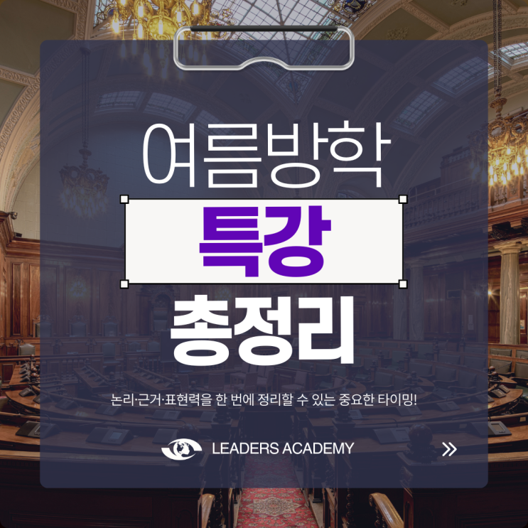 ‘최고의 결과’를 만들며 따뜻한 교육을 실천하는 대치동 영어학원, 리더스아카데미 안녕하세요. 리더스아카데미어학원입니다. 여름방학은 ‘실력 점프’가 가능한 시기이지만, 특히 디베이트 대회를 목표로 하는 재원생에게는 논리·근거·표현력을 한 번에 정리할 수 있는 중요한 타이밍입니다. 그래서 이번 대치 본원 여름방학 특강은 “대회에서 바로 쓰이는 역량”을 중심으로, 재원생과 학부모님께 꼭 필요한 정보만 담아 안내드리겠습니다. 2026 대치본원 여름방학 특강 세션 안내 리더스아카데미어학원 대치본원 여름특강은 3주 과정으로 운영됩니다. 1차 세션(3주): 6/16(화) ~ 7/3(금) - 국제학교 (외국인학교), 해외학....... <img src="https://blogthumb.pstatic.net/MjAyNjAyMjNfMzcg/MDAxNzcxODMxNjYzODEz.eAVYA8OCrTA40en-BtIbRv2sWVVoVXPkLr4hTCroE80g.CQIvCpXwYSl-Oh6fZmu04DuPGHrJy9VlUkxwdZzPIeYg.PNG/1.png?type=s3" />