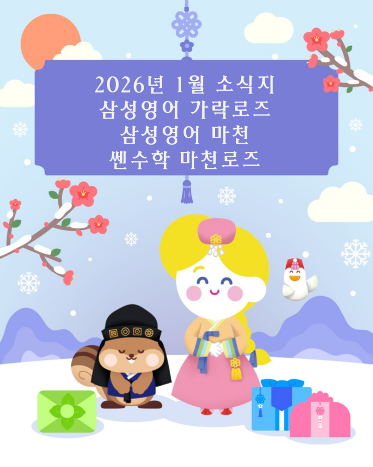 삼성영어 가락로즈 삼성영어 마천 쎈수학 마천로즈 2026년 새해가 되었어요. 첫 주는 연휴랑 연결된 휴일이 있어서 새해 새날 기분을 느끼지 못했고 이번 주 월요일 5일부터가 진짜 새해 시작인 것처럼 느껴집니다. 그래서 우리 학원 소식지도 전할 수 있네요. 지구 자전 공전 주기는 정해져 있는데 왜 나날이 시간은 빨리 지나갈까요? 2025년 1년을 어떻게 보냈는지 잠깐 눈 감았다 뜬 거 같은데, 2026년입니다. 올해는 뭔가 쨍하게 기억 남도록 좀 더 열정을 바쳐 일해봐야겠어요. 새해니까, 새해라서 다짐하면서 우리 학원 소식지 전합니다. ♬ 우리 삼성영어 가락로즈, 삼성영어 마천, 쎈수학 마천로즈 학원은 이렇게 지내고 있답니다. ※ 우....... <img src="https://blogthumb.pstatic.net/MjAyNjAxMDZfMTMy/MDAxNzY3NjczMDcwMTI4.-xQp8xdgEWJ8rWYxolHlyPXG2zCUf9u2kvxt_VXohoog.TTmUvvfx-LL0AisQwqK8MbWzNqx9y6ZR4BvQvxKzG0sg.PNG/2026_1%BF%F9_%BC%D2%BD%C4%C1%F6.png?type=s3" />