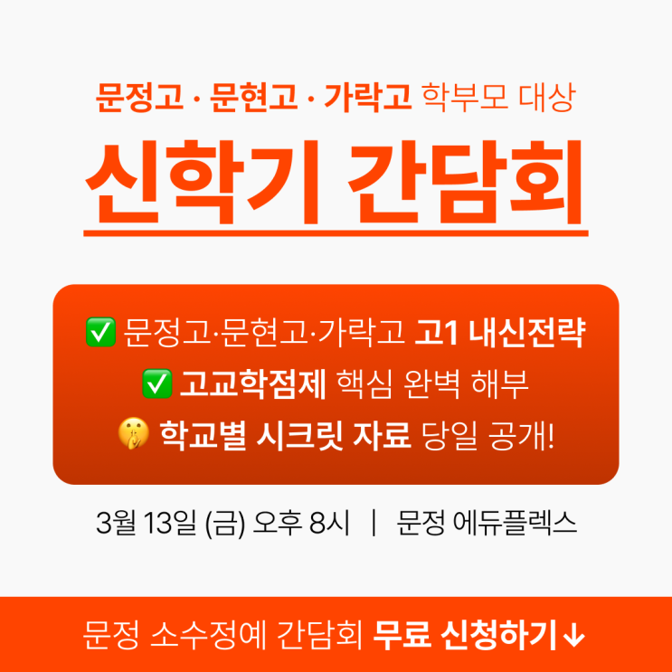 고등학교 1학년 새학기, 아이들은 적응하느라 정신 없지만 사실 이 타이밍이 정말 중요한 이유는 고1 새학기가 성적 구조를 설계하는 출발점이기 때문입니다. 특히 최근 고교학점제와 입시 제도 변화로 인해 학교별 시험 경향과 내신 관리 전략을 꼼꼼하게 준비해두지 못하면 1학기 성적이 그대로 향후 3년의 흐름을 좌우하게 됩니다. 그래서 저희 에듀플렉스 문정점에서는 송파구 학부모님들이 가장 궁금해하시는 내용을 중심으로 핵심만 압축해 정리해드리는 신학기 간담회를 준비했습니다. ✅문정 신학기 간담회 주제 ✔ 문정고, 문현고, 가락고 1학년 내신 완전 분석 ✔ 고교학점제가 내신/입시에 미치는 실제 영향 ✔ 학생부 설계, 무엇을 선....... <img src="https://blogthumb.pstatic.net/MjAyNjAyMjVfMTkg/MDAxNzcxOTk1ODA0MTk4.nyYgGdrQ8rTd58uUDYf-Aw26TxWFQBCiU3UwSqynaa0g.S5RNDyoraIO3Nmjn6lq5Z1FCZWxV49KpVtqYJKtaDX0g.PNG/%B9%AE%C1%A4_3%BF%F9_%B0%A3%B4%E3%C8%B81.png?type=s3" />