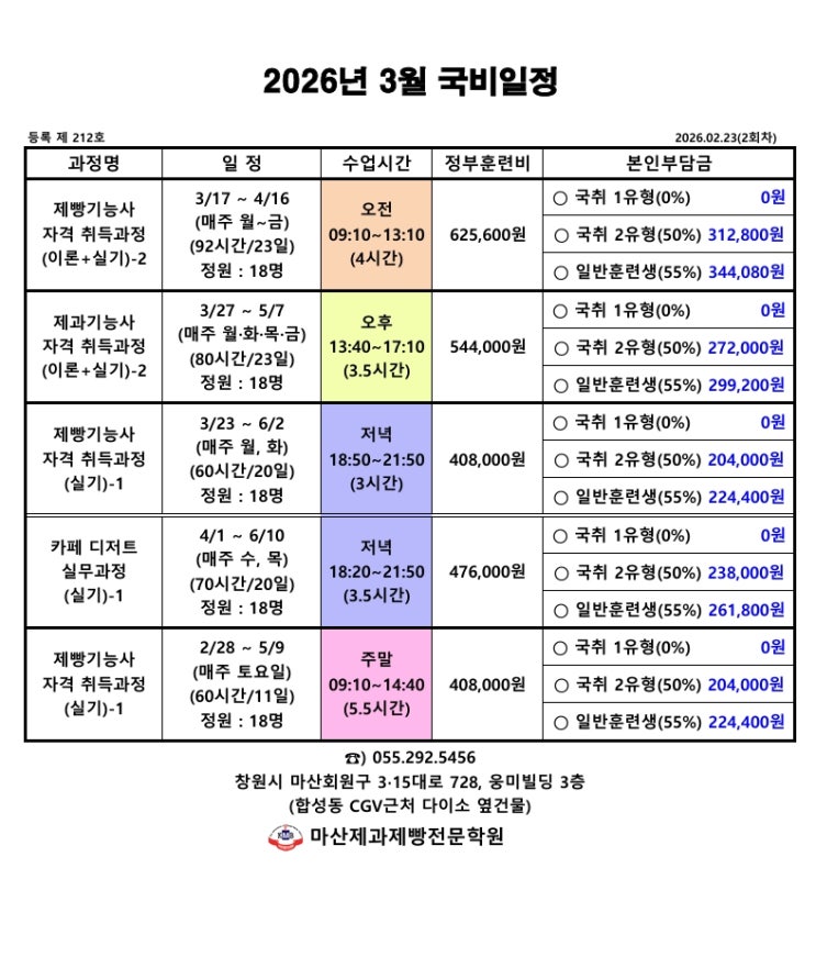 [마산제과제빵전문학원] 2026년 3월 국비일정