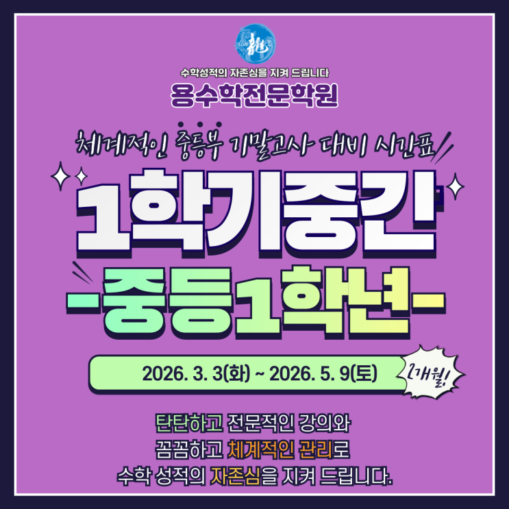 학생의 학습 흐름을 지켜내는 학원, 용수학전문학원 새학기는 학생마다 적응 속도가 크게 달라지는 시기입니다. 학교별 수업 방향이 달라지고 단원 전환도 빠르기 때문에 조금만 흐름이 흔들려도 시험 준비 전체가 불안해질 수 있습니다. 용수학전문학원은 이런 시기일수록 학생 개개인의 흐름을 안정적으로 붙잡아주는 수업 구조를 가장 중요하게 생각합니다. 학생을 깊이 이해하는 관찰 중심 수업 학생마다 문제를 푸는 방식, 개념을 받아들이는 속도, 실수 패턴이 모두 다릅니다. 용수학은 이러한 차이를 단순히 ‘실력’으로 보지 않습니다. 학생이 왜 막혔는지, 어떤 방식으로 설명해야 이해가 빠른지를 수업 과정에서 지속적으로 관찰하며....... <img src="https://blogthumb.pstatic.net/MjAyNjAyMjRfNTAg/MDAxNzcxOTI2NTYwMzIx.CTdHGVpnOqNVZIYCWDZDzaqTE4UeyIMjwhfdkR3HoGEg.LoLXWeQqN2DjbNarXardQP-mqnS3gulc2uylV_o3mnkg.PNG/002_%282%29.png?type=s3" />