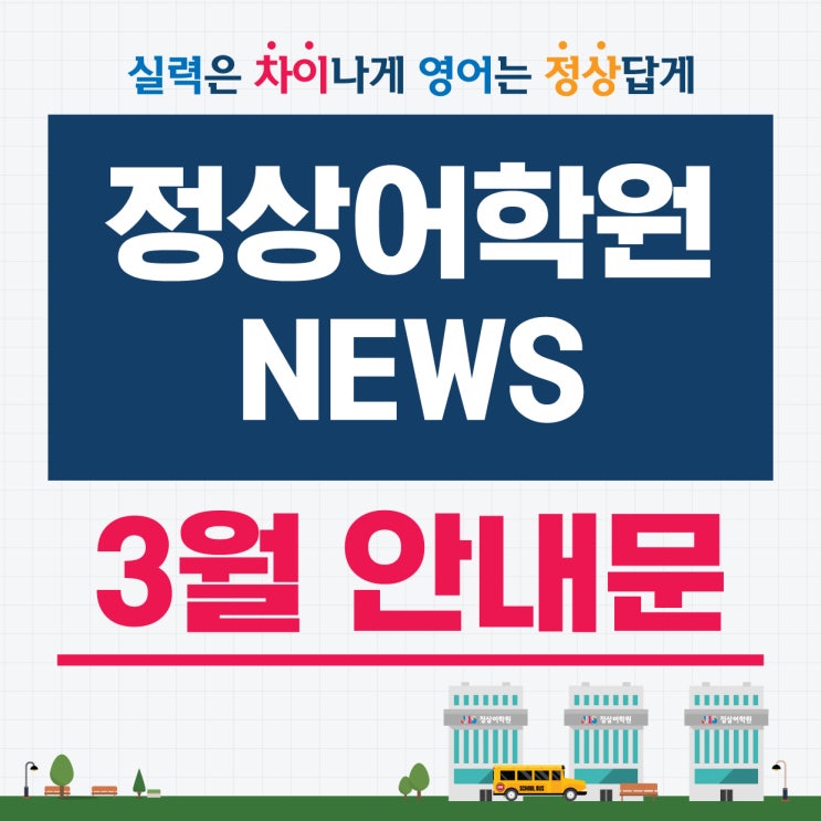 진주 초전/평거/혁신/신진주 `26. 3월 정상어학원 소식 재원생 등록안내 및 주요 학사 일정 3월학기 개강 교재구매 안내 3월 포트폴리오 콘테스트 삼일절 대체 공휴일(3.2 월) 휴강 ※ 항목별 상세 내용은 아래를 참고해 주세요 재원생 등록안내 및 주요 학사 일정 매월 21일 ~ 30일은 재원생의 익월 수강 등록기간 입니다. ■ 수강료 납부 방법 ① 계좌 이체 : 학생별 계좌 번호로 입금 (계좌번호 학원문의) ② 인터넷 카드결제 : JLS 홈페이지 (www.gojls.com) 학부모 ID 로그인 ▷ 교육비 결제 메뉴 ▷ 카드결제 진행 ③ 방문 카드결제 : 학원 방문 후 카드결제 ■ 봄학기(3월~5월) 주요 학사 일정 ▶ 3.02(월) : 삼일절 대체 공휴일 ▶....... <img src="https://blogthumb.pstatic.net/MjAyNjAyMjNfMTU0/MDAxNzcxODIxMzgxMzc1.HoZunDNia05hS1_Iucfmb9W7o4ZsORds1dz3YyeSmLog.H2uvWbDfh1j2FaCklL0hQFSL28D8b54rAnHJijfkU-Eg.JPEG/3%BF%F9.jpg?type=s3" />