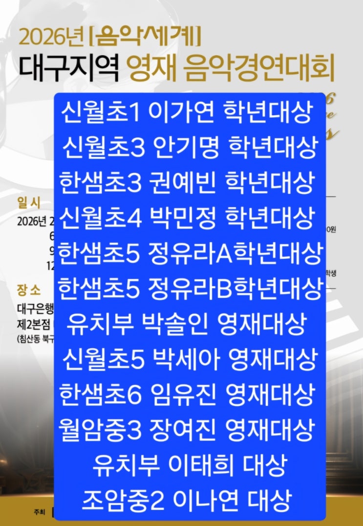 오늘 우리 아이들 대구 음악세계 콩쿨 나가서 학년대상을 휩쓸었어요~ 참고로 대구 음악세계 콩쿨은 전체대상이 없습니다~ 영재대상 이상 수상한 친구는 음악세계콩쿨 전국결선에 진출할 자격이 주어집니다^^ 평소 잘하는 영재반 친구들의 성적이 높게 나온 것도 고마운 일이지만 피아노 입문 10개월만에 예비 영재반 2개월차에 학년대상 받은 우리 1학년 가연이도 대단하고 언니들과 아침 일찍 준비해서 콩쿨 참가해준 우리 유치부들도 기특하고 대견합니다^^ 특히 참가비 두개 내고 두곡 참가한 유라는 두 곡 다 96점 이상으로 학년대상을 받게 되어 너무 고맙고 대단하네요^^ 심사하시는 교수님이 대체 예가 누구냐고 따로 나오셔서 물....... <img src="https://blogthumb.pstatic.net/MjAyNjAyMjFfMTg4/MDAxNzcxNjY1OTAzNDg4.KSQq6EMU7tpcXNkSLxmen1lLpPx-yKFwmn4vlg8n-Qgg.83WgJbonmXSRdh3Vg_ncr2HcG3yc_CQGERnFb_M8dHgg.JPEG/900%A3%DFResized%A3%DF1765767599711%A3%DF1769140592738.jpg?type=s3" />