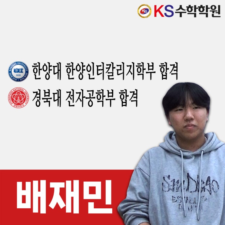 안녕하세요? 인정받는 수학학원! 다사수학학원 KS수학학원입니다! 대건고등학교 출신의 배재민 학생이 KS수학학원에서 함께 공부해서 한양대 한양인터칼리지학부, 경북대 전자공학부에 합격했습니다!!! 오늘은 대학 입시를 준비하는 후배들에게 도움이 될 수 있게 KS수학학원에서 공부한 자랑스러운 우리 배재민 학생의 어려운 문제를 극복하는 방법 등 대입에 도움 될 만한 정보를 인터뷰 영상으로 알려드립니다^^ 한양대 한양인터칼리지학부, 경북대 전자공학부 합격한 배재민 학생 인터뷰 영상입니다^^ 배재민 학생의 한양대 한양인터칼리지학부 합격증입니다^^ 배재민 학생의 경북대 전자공학부 합격증입니다^^ KS수학학원에서 공부한 배재민....... <img src="https://blogthumb.pstatic.net/MjAyNjAyMTNfMTE0/MDAxNzcwOTU2OTM4MjA2.lGSeMiB87Y8Q9_VA5iXlCD4Z3MjwxrAC_R0oQyF2VPwg.A37a07Diwie4BOIMyYUNdv1GZ6KzYOeGPAlHSoNTxfkg.JPEG/%B9%E8%C0%E7%B9%CE_%BA%ED%B7%CE%B1%D7_%BC%B6%B3%D7%C0%CF.jpg?type=s3" />