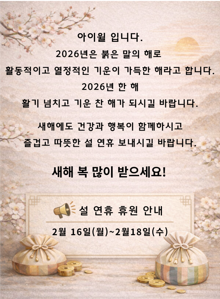아이윌 설 연휴 휴원은 2월 16일(월)~18일(수)입니다. 설이 다가온 거 보니 곧 봄이 오고 새 학기가 시작될 날이 머지않은 듯합니다. 2026년 붉은 말의 기운을 받아 아이윌도 아이윌 친구들도 모두 에너지 넘치는 한 해가 되기를 바랍니다. 행복한 설 연휴 보내시고 새해 복 많이 받으세요!! <img src="https://blogthumb.pstatic.net/MjAyNjAyMTRfMjUx/MDAxNzcxMDUyMDIwMTI0.Z2XGme9zX3njGgVjpu8OAWoy9Af5ddpCW1cvtfgHR_kg.38Kilt7yzP8cB5gMy9WI5OKAO0EQchSPDhTyw-lS_jUg.PNG/%B4%DC%B6%F4_%C5%D8%BD%BA%C6%AE.png?type=s3" />