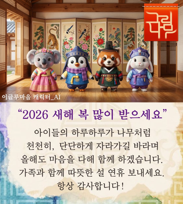 2월 16일 (월) ~ 18일 (수) 까지의 연휴기간은 미술 쉽니다. 이글루마을 수업 진도를 위해 2월 18일 (수) 수업 친구들은 20일 (금)에 수업에 참여해 주세요^^ 늘 오던 시간에 오면 됩니다! <img src="https://blogthumb.pstatic.net/MjAyNjAyMTFfMjgw/MDAxNzcwNzgxMjE4NDAz.zdBGyZrvWfdxv1V6e5A_qtv5e0q3YKbfcH--4gubuMgg.Yb3pdqwwkJvKbNDwYuqOMdhOCjiAqS4qqnr7WC86Kksg.JPEG/2026-%BC%B3%C0%CE%BB%E7_copy.jpg?type=s3" />