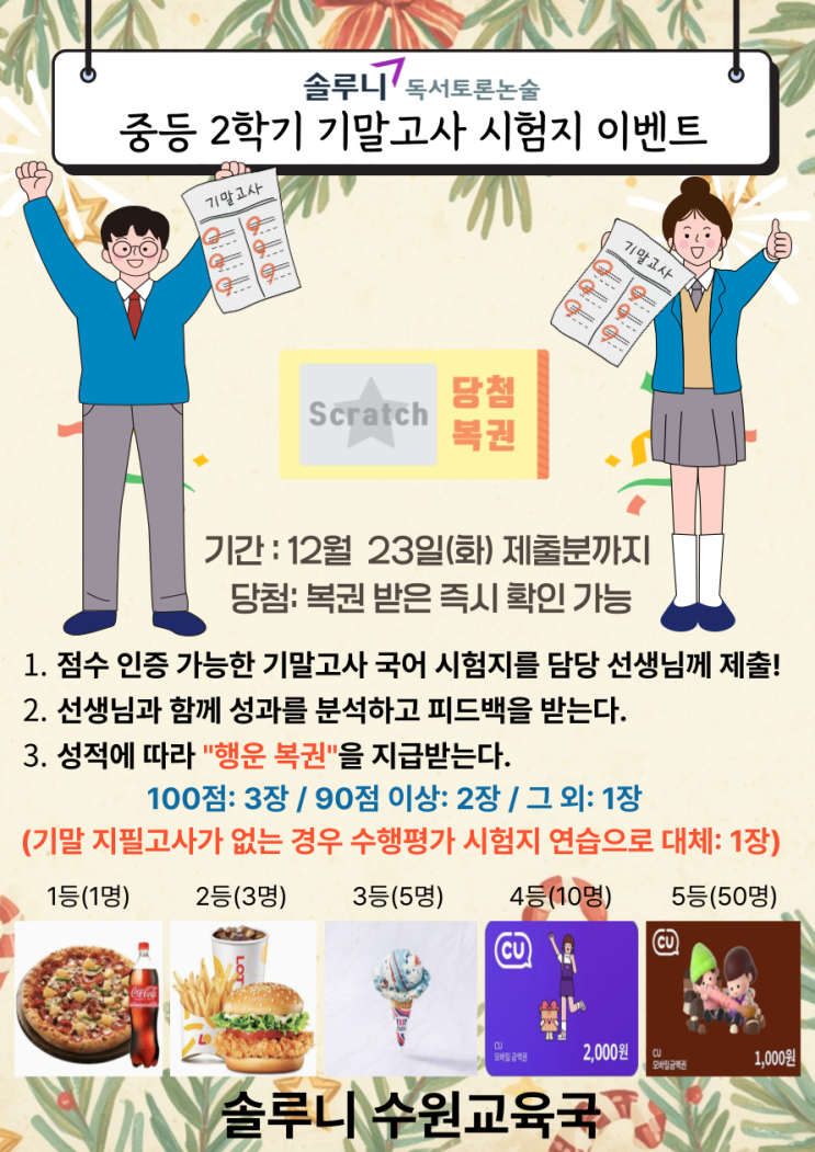 중등 2학기 기말고사 시험지 이벤트 안내! 안녕하세요, 솔루니 수원교육국입니다! 중학교 2학기 기말고사가 마무리되는 시기죠. 한 해 동안 열심히 공부한 우리 학생들에게 더 큰 동기부여와 보상을 드리고자 특별한 이벤트를 준비했습니다. 바로 **“중등 2학기 기말고사 시험지 이벤트”**입니다! 시험 성적도 점검하고, 피드백도 받고, 선물까지 받을 수 있는 알찬 이벤트라 많은 학생들이 매년 기다리고 있는 행사랍니다 이벤트 참여 방법 ✔ 1. 기말고사 국어 시험지를 선생님께 제출! 접수 확인이 가능한 국어 시험지를 담당 선생님께 보여주세요. (만약 시험지가 없는 경우, 수행평가 시험지나 연습지로 대체 가능!) ✔ 2........ <img src="https://blogthumb.pstatic.net/MjAyNTEyMTBfMTMw/MDAxNzY1MzY2NjQyOTQ5.lhvp1JXtxHTJOnRqCgEP1ArQBQDmPx9MffRnVwYPq1kg.GHgE_WIzXeN_pmJxpYNDz2j_vwll6TefXY49NPRzyUcg.PNG/1765366409576.png?type=s3" />