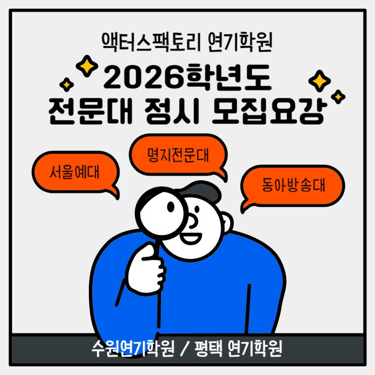 안녕하세요 수원 연기학원 액터스 팩토리입니다. 오늘은 2026 정시 전문대 모집요강을 안내해 드리고자 합니다. 세부적 학교마다의 특징과 맞춤 실기시험 방법은 다음 포스팅에 남기고 오늘은 간략한 일정과 실기, 교과 반영 등만 안내해 드리겠습니다. 그에 앞서 액터스팩토리에서는 겨울방학을 맞이해 겨울방학 특강반을 모집중입니다. 관심있는 학생이라면 살펴보시고 서둘러 접수해주세요! 자 그럼 26학년도 전문대 정시 요강을 살펴볼까요! 수시가 끝나고 결과가 좋지 못해서 실망하고 있는 입시생 분들이 많으실 텐데요, 그러실 필요가 없습니다! 우리에겐 정시가 있습니다! 정시에 한 번 더 기회가 있으니 최선을 다하여 2026 입시를 마무....... <img src="https://blogthumb.pstatic.net/MjAyNTEyMTdfODYg/MDAxNzY1OTY0MzYwNzIz.kQNgcu0zG2iu58GKNfh5iwzd__TkXFKiw2uzfYBnzUIg.estiEZ7LGj8zeiYrzuBqq9JHD5P1BEBM2NzsyM4bKGEg.JPEG/%C1%A6%B8%F1%C0%BB_%C0%D4%B7%C2%C7%D8%C1%D6%BC%BC%BF%E4_-001.jpg?type=s3" />