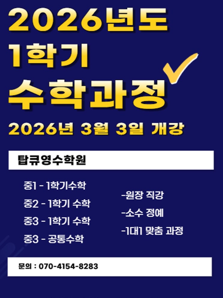 2026학년도 1학기 수학반 개강 안내드립니다. 3월 3일 개강 예정이며 원장님 직강 클래스입니다. 중1 1학기 수학반 / 중2 1학기 수학반 / 중3 1학기 수학반 / 중3 공통수학반 총 4개의 반이 개강됩니다 상담문의 : 070.4154.8283 탑큐영수학원 <img src="https://blogthumb.pstatic.net/MjAyNjAyMTlfMjcg/MDAxNzcxNTA1NzU5MTEx.Vh_EZ1mAD0A4cGRXiHF7TgcgaCVuUbRfmi_ohjKin9Ug.BX962aBMWhimV2lGhBqGJKvAzQbpyY3p6826PIi99Dgg.JPEG/KakaoTalk_20260219_202911225.jpg?type=s3" />