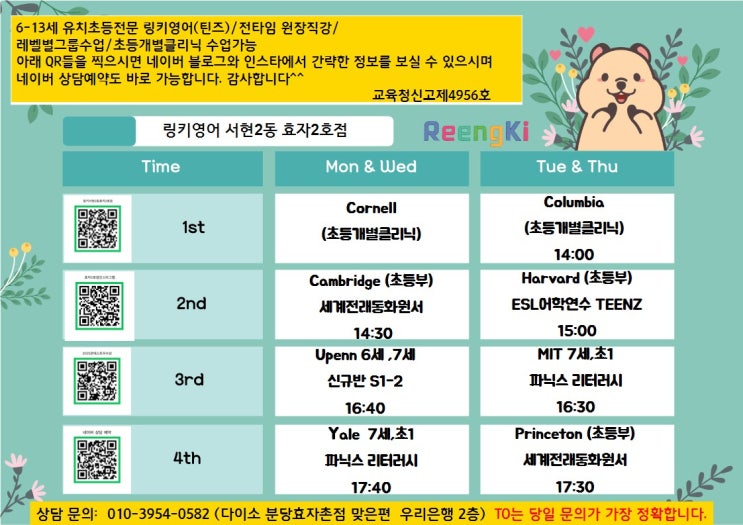 분당 유치초등영어 링키영어 2026년도 시간표 안내