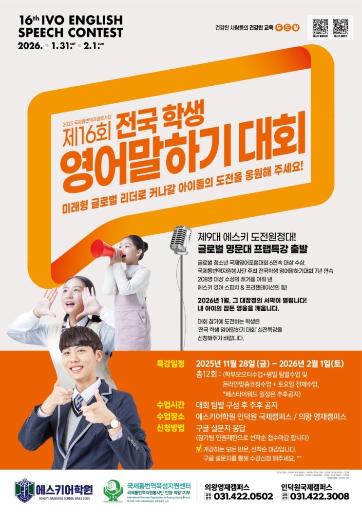 안녕하세요~ 초, 중, 고 연계교육 20년 최고의 변화와 기회를 만드는 건강한 사람들의 건강한 교육 두드림 포일동영어학원 에스키어학원입니다. 오랫동안 기다려온 순간! 에스키 제9대 도전원정대의 여정이 이번 겨울, 드디어 시작되었는데요. 오늘 포스팅에서는 제16회 전국 학생 영어 말하기 대회를 향해 ✅️ 11/28(금) 명문대 스펙특강 1회차 - 맹모삼천지교 오프닝 특강부터 ✅️ 12/13(토) 명문대 스펙특강 4회차 - 도전원정대 출항식까지! 본격적인 여정을 시작한 에스키 제9대 도전원정대 스펙특강 그 첫 번째 이야기를 전해드리려고 합니다. 1회차: 맹모맘 오프닝 특강 에스키 전영말 스펙특강은 항상 아이가 아닌 부모님을 위....... <img src="https://blogthumb.pstatic.net/MjAyNTEyMThfNzcg/MDAxNzY2MDM5MzE0NDY1.U233iVTYImPwdPu7pY0jegHiLsmPm11XaxMhw3RSIkwg.Ws2XCbYkk7jXbmm3eQeurIoBVhxyMQ7UOFGrEca4Eaog.JPEG/%BF%A1%BD%BA%C5%B0%A1%D9%BF%C2%BD%C9%B8%B6%C4%C9%C6%C3_%BB%E7%C1%F8_20251218_2.jpg?type=s3" />