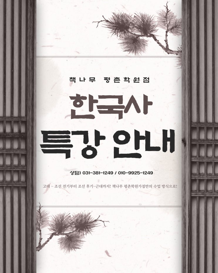 안녕하세요, 송선생국어학원&책나무 평촌학원가점입니다 :) 다음 달에 시작 예정인 한국사 특강을 다시 한번 공지하려고 합니다!! 이번 책나무에서 열리는 한국사 특강은 책나무 재원생&비재원생 중 예비초4~6학년 학생들을 대상으로 진행됩니다. [수업 기간] 26년 1월 8일 (목) ~ 2월 27일 (금) *총 8회 수업 [수업 시간] 1) 고대 ~ 조선 전기 : 목/금 오전 10시 ~ 11시 30분 2) 조선 후기 ~ 근대 : 목/금 오전 11시 30분 ~ 오후 1시 *2개의 수업 중 희망하는 수업 선택 가능 이번 한국사 특강에서는 어려운 한자 용어가 많아 어렵게 느껴질 수 있는 내용을, 책나무 평촌학원가점만의 수업 방식으로 쉽게 이해할 수 있도록 한국사 특강....... <img src="https://blogthumb.pstatic.net/MjAyNTEyMjBfMjQ2/MDAxNzY2MjEyMTA1NDQy.562-SbyriN6_GQDdZ26EDJzBsxynIjj5lZuXblvsIB0g.5yVbQNqEoM1wJfj7kkwl_ufztKeYQ5DPsodF1PbNpA8g.JPEG/001.jpg?type=s3" />