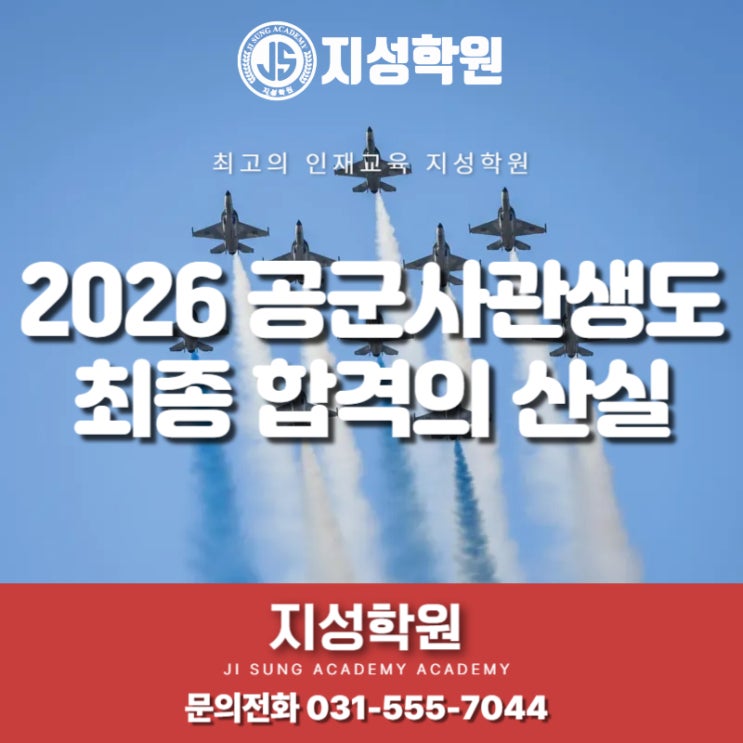 2026 공군사관생도 최종 합격의 산실, 인창동 지성학원 2026학년도 제78기 공군사관생도 선발시험에서 저희 인창동 지성학원의 한 학생이 최종 합격이라는 매우 영광스러운 결과를 이뤄냈습니다. 수많은 지원자들 중 엄정한 평가를 통과하여 당당히 합격의 깃발을 꽂은 이 학생에게 진심으로 깊은 축하의 박수를 보냅니다. 이는 학생의 노력이자, 저희 학원의 자랑입니다. 공군사관학교 입시는 단순히 학업 성적만 우수하다고 해서 합격할 수 있는 시험이 아닙니다. 다들 잘 알고 계시는 바와 같이, 철저한 학업 능력은 물론, 강인한 체력, 뛰어난 면접 능력, 확고한 역사 및 안보관, 심층적인 인성 평가 등 다방면에 걸쳐 최상위권의 역량을 요....... <img src="https://blogthumb.pstatic.net/MjAyNTEyMjNfMjYx/MDAxNzY2NDcwMzY1NTAz.RJQET0GamCiXMInNnQ-GGJfqvUX8WizLxmxC9qNVtBcg.M10c1MD5-Kbjqpzo6jtaWVJF1czCqfQpRSioGoAl2a4g.JPEG/001.jpg?type=s3" />