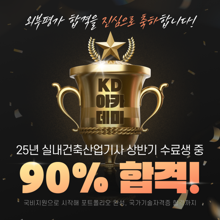 최근 KD아카데미에서는 과정평가형 외부평가에서 의미 있는 성과를 거두었습니다. 훈련생 응시인원 중 90% 합격! 이 결과는 단순한 시험 합격을 넘어, 체계적인 국비훈련 과정 운영과 실무 중심 교육이 만들어낸 결과라고 할 수 있습니다. 해당 과정은 단순한 시험 대비 과정이 아닌, ✔ 국비지원으로 부담 없이 시작하고 ✔ 실무 중심 수업과 포트폴리오 제작을 통해 ✔ 국가기술자격증 합격까지 이어지는 체계적인 교육 과정으로 운영되고 있습니다. 과정평가형자격 외부평가 왜 합격률로 증명되는 과정일까요? 과정평가형 자격은 ✔️ 정해진 훈련과정을 성실히 이수하고 ✔️ 출석·평가 기준을 충족한 훈련생만 ✔️ 외부평가에 응시할....... <img src="https://blogthumb.pstatic.net/MjAyNTEyMjRfMjk0/MDAxNzY2NTQ3NjQyMTQ1.3ASptveUJmihH7uQRcHhMgu1iu-3JlFsJWV78cyWtx0g.LTFaOAd9s4nmQ51Zxb7PP2qN3urujX_PHvgLAmWoKEIg.PNG/%BD%C7%B3%BB%B0%C7%C3%E0_%BF%DC%BA%CE%C6%F2%B0%A1_90%C7%D5%B0%DD.png?type=s3" />