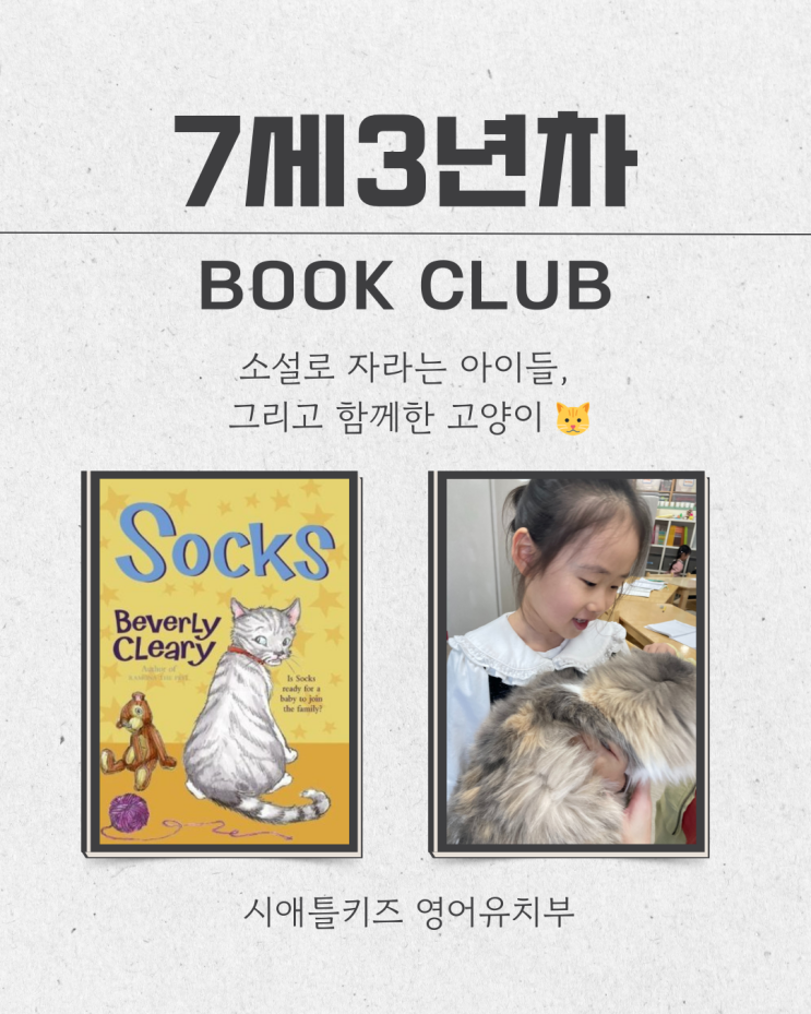 Socks – 소설 수업 이야기 『Socks』는 Beverly Cleary 작가가 쓴 따뜻한 챕터북 소설입니다. SKIE 7세 3년차 친구들은 2학기부터 본격적으로 ‘소설책(챕터북)’ 수업을 시작합니다. 단순히 문장을 읽는 단계가 아니라, *이야기를 이해하고, 생각하고, 표현하는 ‘진짜 리딩 수업’*이 시작되는 시기입니다. 아이들은 소설을 함께 읽으며 내용을 이해하는 것은 물론, 등장인물의 감정과 사건을 정리하고, 자신의 생각을 글과 말로 표현하는 연습까지 이어가고 있습니다. 이번에 읽고 있는 책은 “Socks” 챕터북인 만큼 한 번에 모두 읽기보다는 이야기를 나누어 끊어 읽기(Chunk Reading) 방식으로 진행합니다. ✔ 읽기 전 (Before ....... <img src="https://blogthumb.pstatic.net/MjAyNjAyMDRfMTY0/MDAxNzcwMTgxOTc3MDc4.CqzRKhgGHqVUKeFQgfMJz5guoPQ4hjYawIHGIUpItpYg.IHpsg6cmXDLQxRqphGP7HgkFhR5jEMYcrVwp5NLPHwAg.PNG/7%BC%BC3%B3%E2%C2%F7_%281%29.png?type=s3" />