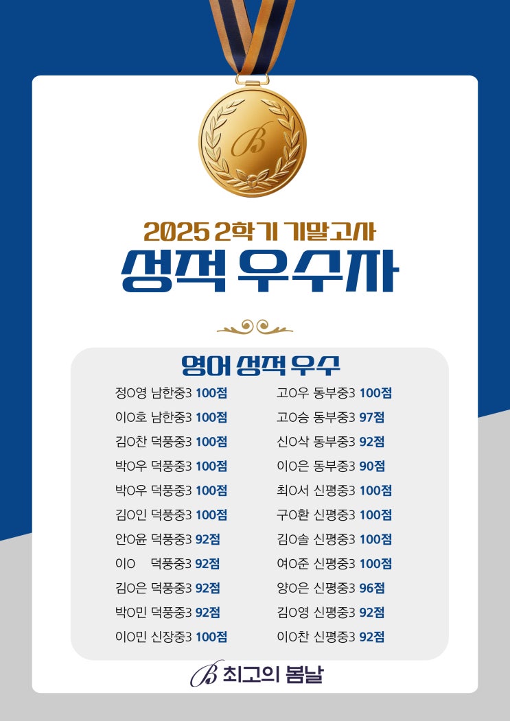 기다리던 2학기 기말고사 중등 성적이 발표되었습니다! 최고의 봄날에서 공부한 아이들의 노력은 이번에도 분명한 변화로 이어졌습니다. 최고의 봄날에서 하루하루 버텨낸 연습과 반복, 그 시간들이 어떤 결과로 이어졌는지 함께 살펴볼까요? 영어 성적부터 살펴보겠습니다 ~ ! 단어·문법·지문 분석까지 기본을 철저히 지켜온 학생들입니다. 시험 직전의 벼락치기보다 평소 학습 루틴을 꾸준히 유지한 것이 영어 100점이라는 안정적인 성적으로 잘 나타났네요! 90점대 친구들은 지문 이해와 문법 적용에서 전반적으로 안정적인 모습을 보였습니다! 일부 표현이나 서술형에서 점수가 갈렸지만, 학습 방향이 정확하기 때문에 다음 시험에서는 더 큰....... <img src="https://blogthumb.pstatic.net/MjAyNTEyMjlfNTcg/MDAxNzY3MDAwMTQ2MDMy.Rjh9EvwXu9IIDFr9bfO9k0qtOBfZJlHjz7OichgPWgAg.s4DRekXPfAqpgFhZXSqozA961b6h1Ue_Dds-NPuSvTog.JPEG/013.jpg?type=s3" />