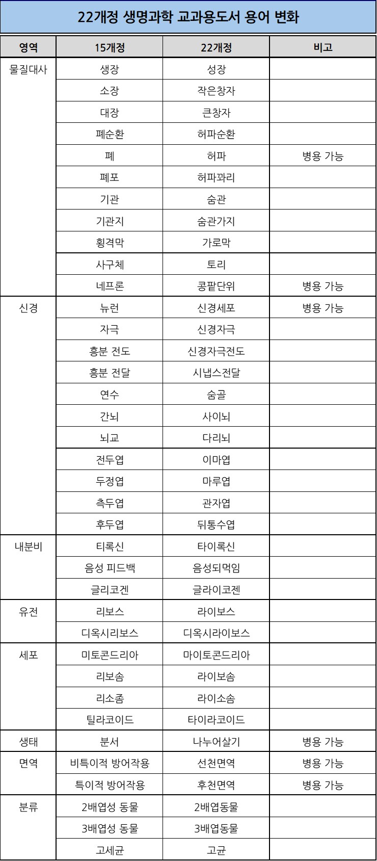 22개정 생명과학 용어변화
