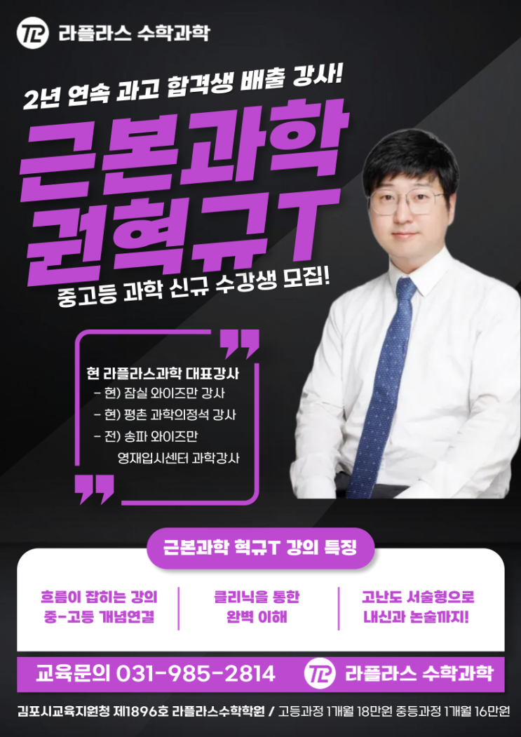 과학 수업 신청 방법 1. 학원 대표번호(031-985-2814)로 연락 2. 학원 문자전용번호(010-7625-2814)로 문자 3. 아래 신청 링크로 바로 신청하기 ⬇️과학 신청 링크⬇️ https://forms.gle/3Y3VvrAa3QxDokq76 ⬆️과학 신청 링크⬆️ 안녕하세요! 풍무동 과학학원 라플라스수학과학 학원입니다! 26년도 1학기 과학 신입생을 모집합니다. 이번 과학반은 연간 계획대로 진행되며, 월별로 다른 단원의 수업이 진행되므로 중간 합류가 언제든 가능합니다! 특별히, 3월 셋째주부터는 과학 내신대비가 시작됩니다! 따라서 내신대비 수업은 3월 셋째주부터 시작이지만, 원활한 수업의 적응과 대비를 위해 3월 첫 주 부터 미리 등록하는 것을 강력 추천드....... <img src="https://blogthumb.pstatic.net/MjAyNjAyMjRfMyAg/MDAxNzcxODY1Mzk5OTAy.7zS3CzJ4CKcDt5jud487RNCOBtYDVn5Qdu7BbkBs3RIg.yw3oO87WbtUUAIOmsLprkxBlemZYRSdmYIsocdfNXrQg.PNG/001.png?type=s3" />