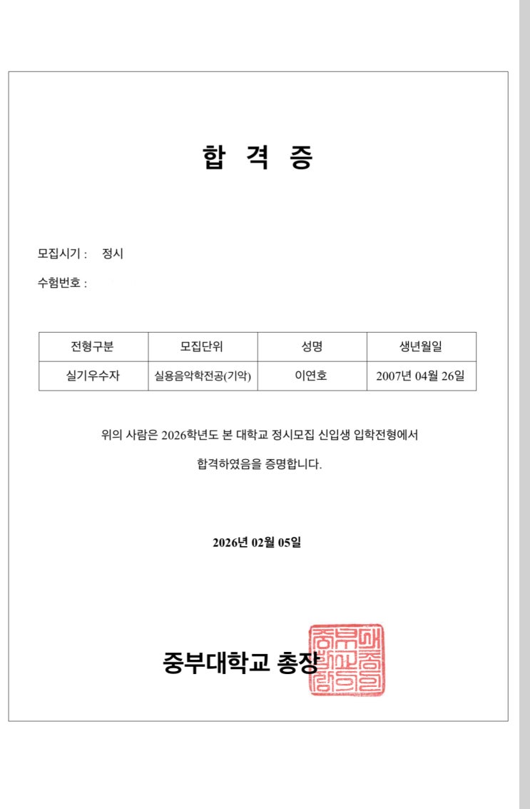 안녕하세요 김포실용음악학원 최고의 합격률의 지앤디 실용음악학원입니다! 이번 2026학년도 정시 합격생 소식 올립니다~ 드럼전공 이연호 학생이 중부대 실용음악과 정시 최종 합격하였습니다~ 합격을 축하합니다!! #김포실용음악학원 #정시합격 #드럼전공 #드럼입시 #화성학 #이론 #드럼레슨 #앙상블 #중부대실용음악과 #지앤디실용음악학원 <img src="https://blogthumb.pstatic.net/MjAyNjAyMjRfMzgg/MDAxNzcxOTE3MjIzMzUx.4hQdVBnoqKdtoiA9fRnIeeucgsBTfWx0ppzdyozggRkg.nR-McRHhI2Yxp_QW2qkdbC6FgN0auiE6YFL9srmaqGwg.JPEG/IMG_1432.JPG?type=s3" />