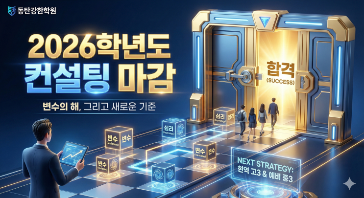 안녕하세요. 동탄강한학원입니다. 치열했던 2026학년도 입시 컨설팅이 오늘을 기점으로 모두 마감되었습니다. 저는 수능 국어를 가르치는 강사이자, 매해 한정된 인원만을 맡아 ‘합격’이라는 문을 함께 여는 입시 컨설턴트로서 누구보다 뜨거운 겨울을 보냈습니다. 올해는 그 어느 때보다 ‘변수’가 많았고, ‘심리’가 입시 판도를 흔든 해였습니다. 오늘 포스팅에서는 올해 진행했던 컨설팅에 대한 소회와 더불어, 현역 고3과 예비 중3 학생들을 위한 향후 입시 전략을 전문가의 시선으로 정리해 드리고자 합니다. 1. 2024년 컨설팅 결산 : "양보다 질"을 선택한 이유 저는 무한정 많은 인원을 받지 않습니다. 제가 가르치는 학생....... <img src="https://blogthumb.pstatic.net/MjAyNTEyMjZfMjUx/MDAxNzY2NzIzMjg4ODAx.nxcHZr9M2Uveewg6uJQwdfiq6TLt49iJ5rwaAAx31tQg.l1X_HRXU9kgyC7-LGO4ST_rKHcCTqhElIIzYCZfClPIg.PNG/Gemini_Generated_Image_56spr656spr656sp.png?type=s3" />