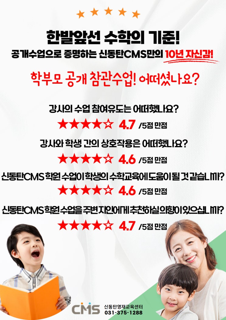 ★★★결과만 증명하던 시대는 끝났습니다★★★ 이제는 과정까지 직접 보여드리는 수업이 기준이 됩니다. 최근 진행된 신동탄CMS 학부모 공개 참관수업에 참여하신 학부모님들께서 ✔ 수업 몰입도 ✔ 아이들의 사고 과정 ✔ 교사와 학생 간 상호작용 ✔ 질문·발표·토론이 살아있는 수업 분위기 에 대해 <<매우 높은 만족도(평균 4.6~4.7점/5점)>>를 보여주셨습니다. 실제 학부모 후기 중 일부입니다. “정답을 바로 알려주지 않고, 아이의 생각을 끝까지 이끌어 주셔서 좋았습니다.” “아이들이 질문하고 발표하며 수업에 적극 참여하는 모습이 인상 깊었습니다.” “수업 마지막에 게임 형식으로 이해도를 점검해, 아이가 제....... <img src="https://blogthumb.pstatic.net/MjAyNTEyMjlfMjY5/MDAxNzY3MDA3OTA4MDQy.3NIsKfgka-GxPynW93KX7ioAVT4ofD1ocj-sdloFH0wg.xVYvY8tcyH6ss0mNtBHH6sN25HesCHAzyEte1Sq_jeUg.JPEG/%C0%CC%BA%A5%C6%AE_%C3%CA%B4%EB%C0%E5%C8%C4%B1%E2%C8%AB%BA%B8_1.jpg?type=s3" />