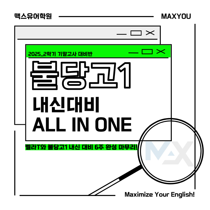 안녕하세요. 불당동 영어학원 맥스유어학원입니다. 불당고1 영어 내신 시험을 앞두고 맥스유어학원 고등부는 직전보강일에 자체 제작 동형 모의고사 수업을 진행했습니다. 직전보강일에는 불당고1 영어 내신을 기준으로 문항 구성·난이도·유형까지 모두 고려하여 실전보다 더 어려운 난도로 동형 모의고사를 제작했습니다. 이번 불당고1 영어 시험은 결코 아주 쉬운 시험은 아니었습니다. 85점 이상을 받아야 안정적 1등급을 기대할 수 있을 정도의 난이도였습니다. 그럼에도 불구하고 이번 시험에서 100점 만점 학생이 3명 나왔습니다. (90점 이상 및 2학기 1등급을 성취한 학생들은 추후 공지 예정입니다.) 고등부 영어 내신 성과는 학원이나 강....... <img src="https://blogthumb.pstatic.net/MjAyNTEyMjFfMjQz/MDAxNzY2MjU1MDc1NjI0.WOXiLT1hncPFbpTSg0GXlhm4a45TH_4eek8vNSMNm9Mg.FkmFg0piFH64zxY6H4q-dfOf4lJYCjpptvRWrSABRYAg.PNG/%C1%A6%B8%F1%C0%BB_%C0%D4%B7%C2%C7%D8%C1%D6%BC%BC%BF%E4._%2831%29.png?type=s3" />