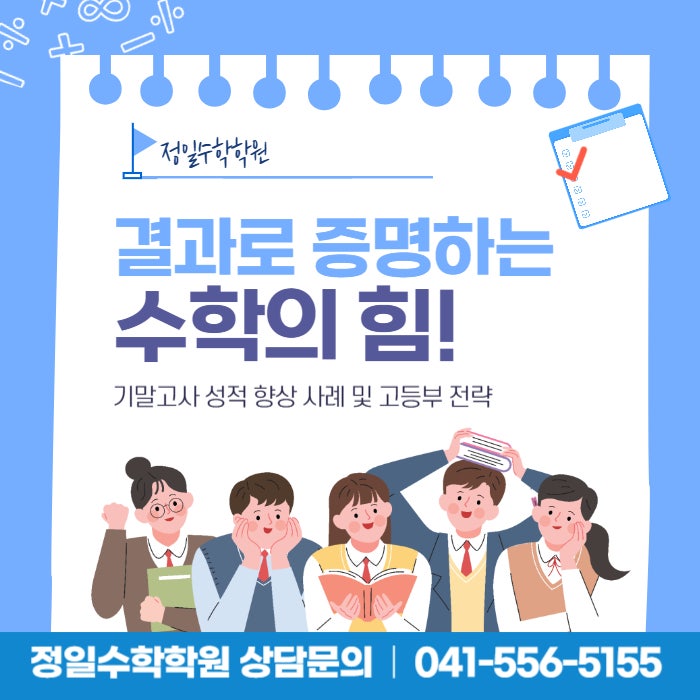 대치동 수학 강의를 천안에서도! 안녕하세요! 천안 서북구에 위치한 정일수학학원입니다. 유난히 추웠던 기말고사 기간이 지나고 이제 한 해를 마무리하는 시점이 되었습니다. 그동안 정일수학학원에서 밤낮없이 코끝에 땀방울이 맺히도록 공부한 학생들의 노력이 빛나는 결실로 돌아와 매우 뿌듯한 마음입니다. 오늘은 이번 기말고사에서 정일수학학원 학생들이 보여준 놀라운 성적 향상 결과와 함께, 앞으로의 학습 방향에 대해 진솔하게 이야기를 나누어보고자 해요. 중등부: 실력 향상을 이뤄내다! 이번 기말고사에서 정일수학학원 중등부 학생들은 그 어느 때보다 압도적인 성취를 보여주었습니다. 단순히 몇몇 우수한 학생의 결과가 아닌, ....... <img src="https://blogthumb.pstatic.net/MjAyNTEyMjNfMTcy/MDAxNzY2NDUyNzU2MTEy.J30DJ-D4UqEqm5_zHzQQah2jxLzDOderFYSUYVo8jMEg.eKKoah6Tkn53K7JhYov6qXewEnwFl03RHbyxAf6NpeEg.JPEG/%B5%CE%C1%A4%B5%BF_%C1%DF%B0%ED%B5%EE_%BC%F6%C7%D0%C7%D0%BF%F8_%281%29.jpg?type=s3" />