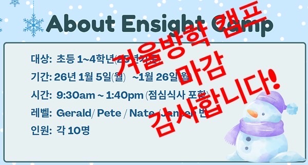 안녕하세요. 책을 읽고, 생각을 표현하다 Ensight 영어입니다. 지난 11월에는 18일, 22일 이틀에 걸쳐 2026 Winter Camp 설명회를 진행하였으며, 그 어느 때보다 따뜻하고, 또 뜨거운 시간이었습니다. 아침 햇빛이 아직 채 교실을 채우기도 전부터 학부모님들이 하나둘 자리에 앉기 시작했고, 준비된 의자가 금세 가득 차 더 많은 의자를 옮겨야 할 정도였어요. 아이를 위해 시간을 내어 오신 부모님들께 다시 한번 감사의 말씀드립니다. 특히 이번 설명회는 평일 오전임에도 참석률이 놀라울 만큼 높았고, 설명회 시작전부터 이어진 레벨테스트 문의에 대한 열기도 그 온기를 더해주었습니다. 이번 캠프는 신도림초, 신미림초, 미래초 뿐 아니라....... <img src="https://blogthumb.pstatic.net/MjAyNTEyMDhfODkg/MDAxNzY1MTU4MjAwOTU5.IN0tF4epFk2_ij-3iSM3E0-X9CDLkU0_t1h499qWNCIg.R-FlqU92W0HbR9ooTymF8Gh3un1o_OE5h2U2QRpXmyUg.JPEG/KakaoTalk_20251208_104027807.jpg?type=s3" />