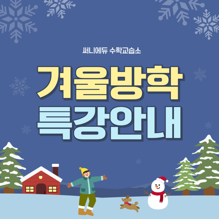 안녕하세요 수학이 즐거워지는 공간 써니에듀 써니쌤입니다. 오늘은 2026년 겨울방학 특강을 간단하게 소개합니다. ☃️ 겨울방학 특강 안내 (5주 과정) ❄️ 특강 기간: 2026.01.12.(월) ~ 2026.02.13.(금) (5주동안 5회수업) 신청 기간: 2025.12.15.(월) ~ 2026.01.06.(화) 1. 직접 만드는 체험수학 (초등) 2. ➕➖ 곱셈특강 / ➗ 분수특강 (예비 중등) 3. 수해력 어휘특강 4. 평면/입체/작도 도형 특강 (초등 ~ 예비 중등) 5. 교재집중 / 매쓰토픽 특강 (초등) 수업 문의 궁금한 점이 있으시면 언제든지 문의해 주세요. 전화 문의: 0507-1493-3456 (문자 문의) [참고 사항] 모든 수업은 선착순 마감이며, 재원생 우....... <img src="https://blogthumb.pstatic.net/MjAyNTEyMTZfMjU1/MDAxNzY1ODQ4MTA5ODY4.N_xoNTB_NYxoSGx-RE9Zm-ReaZT5J4QMoEF-vbFrn9Eg.PlfP4IPcOn0ON5D659Y_PTdY7ST4GjQ3QgR70J29AxYg.PNG/001.png?type=s3" />