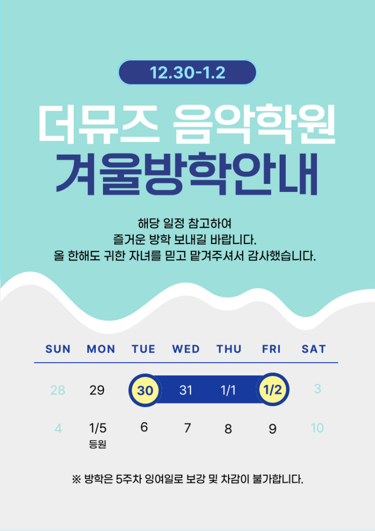 더뮤즈 음악학원 입니다. 한 해 동안 열심히 달려온 우리 아이들과 선생님들의 재충전 시간을 위해 위와 같이 겨울방학 기간을 갖습니다. ☺️ 해당 기간은 학원 휴무로 인해 전화 상담 및 방문 상담이 진행되지 않습니다. 문의 사항 남겨주시면 방학이 끝난 후 1월 5일(월)부터 순차적으로 답변드리겠습니다. 감사합니다! <img src="https://blogthumb.pstatic.net/MjAyNTEyMThfMTMx/MDAxNzY2MDIzMDQ3NDc4.Smvumbx1lvoSnXh_XcLxRf7DGcherZAKwk3lC75jQmsg.JXmND-YtpaloW0hAfe2eFTP5TLWJNiHqApDP0z9ZP3og.PNG/IMG%A3%DF1976.PNG?type=s3" />