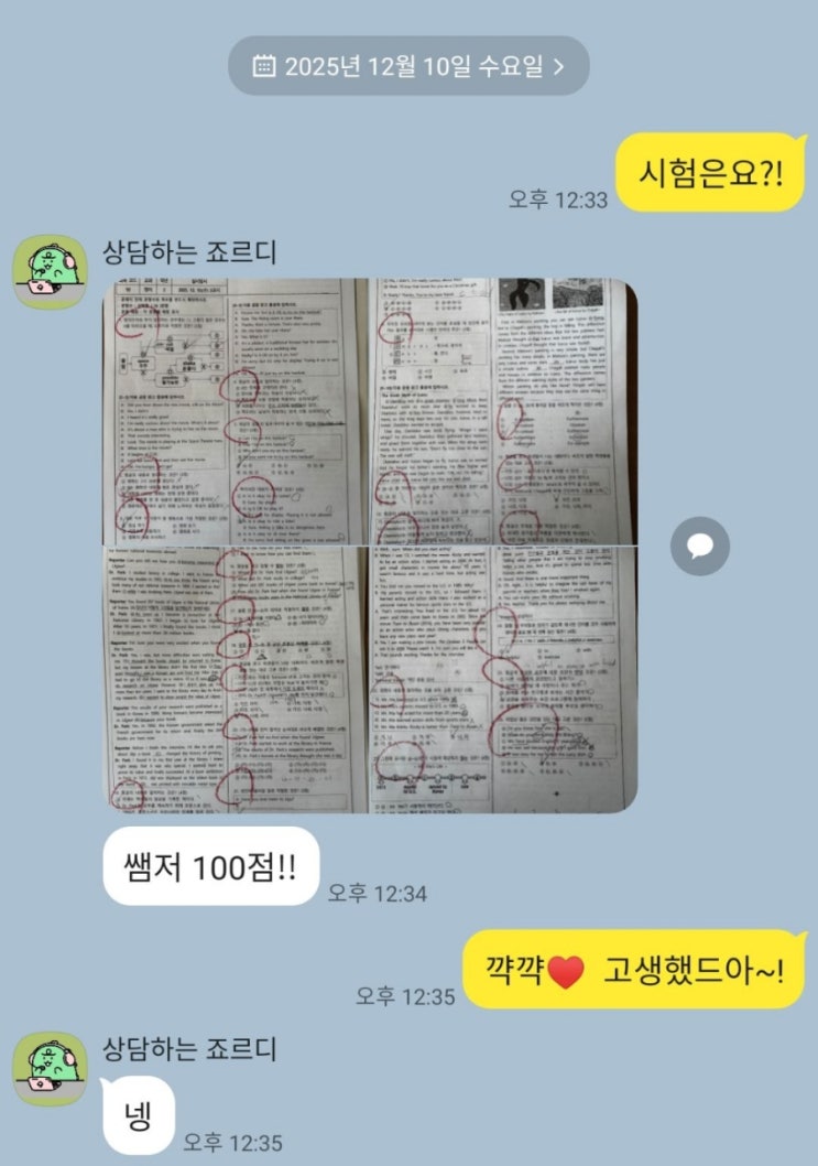 드디어 2주에 걸친 기말 끝! 신흥중 1학년 100점 신흥중 2학년 100점 동해중 1학년 100점 포은중 2학년 100점 지났지만 포은중 3학년 100점 포함 기말에서 원에 있는 학교당 한명씩은 이 나왔어요 지난 중간고사 비해서 성적이 많이 오른 학생들도 꽤 있어서 기쁜 마음입니다 노력한거에 비해 성적이 쪼끔 안나온 친구들은 같이 유형과 오답 분석하며 또 나아가고 있습니다 평소 어휘와 구문에 집중하는 빡센 수업이어서 오히려 내신대비 기간이 좀 편하다는 우리 아이들. 시험 마무리와 동시에 또 혹독하게 어휘 익히기 들어가고 재시치러 나오고 있는 중입니다. 멀리보고 멀리 나아갈 수 있게 되길 같이 노력할께요! #쑤잉글리시 #신흥중....... <img src="https://blogthumb.pstatic.net/MjAyNTEyMThfMTk4/MDAxNzY2MDU4NzYwNzI4.Ek-En52HmbdxPjEgfhdkQmP3hXcYzMOLvH2h4JcDBk0g.8W1tLc9iK1F4a1X0g6IIuRyVVDtGJYIDoXV_GdjZQ48g.JPEG/900%A3%DF1766057316555.jpg?type=s3" />