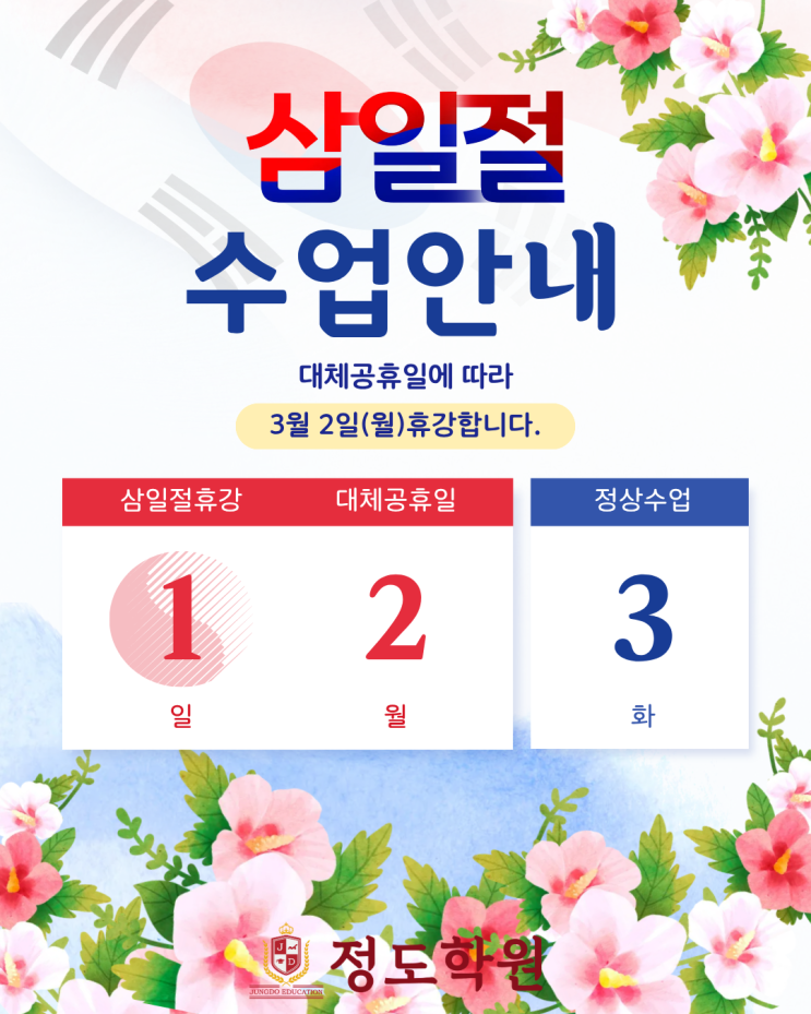 [3·1절 일정] 정도학원 3·1절 휴강/일정┃상모/사곡/임은/오태/광평/공단┃영수과학원/영어학원/수학학원/과학학원