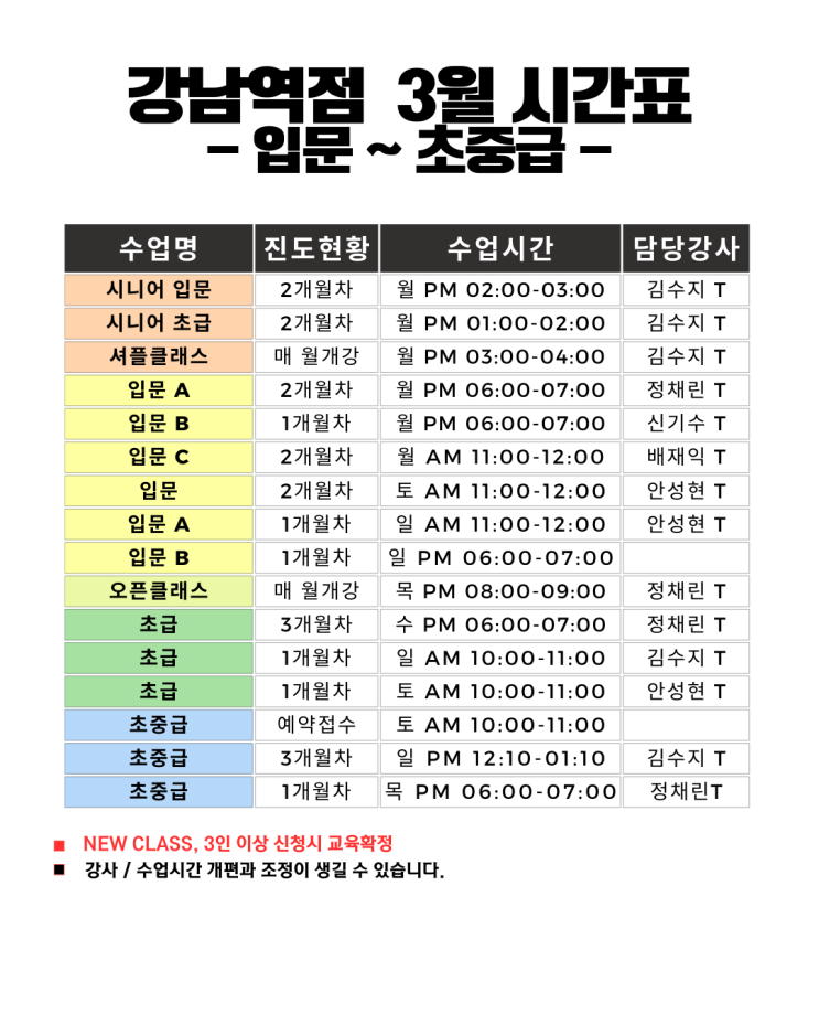 [셔플댄스] 강남역점 구디본점 3월 수업 시간표