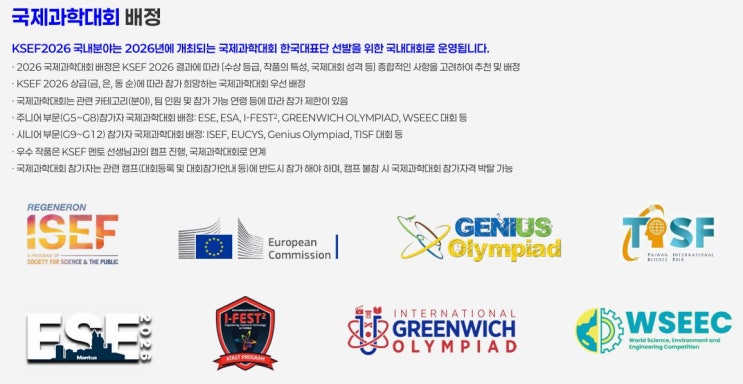 2026 국제 과학대회 출전하는 한국대표단 학생들을 응원합니다. GO: 고등부 1팀 출전 IGO: 초등부 2팀, 중등부 4팀 , 고등부 2팀 출전 ISIF: 중등부 3팀 출전 <img src="https://blogthumb.pstatic.net/MjAyNjAyMTRfNDIg/MDAxNzcxMDQ3ODQ5ODE1.7nMFpzUzb8WYU4lEG4yz9WhPEgLkn7m2uO9i1fjhC8sg.eSBovGJqSoh_JORBm3qQqhRabfZEmfVc8pa-zOzjuFgg.JPEG/%C4%B8%C3%B31.JPG?type=s3" />