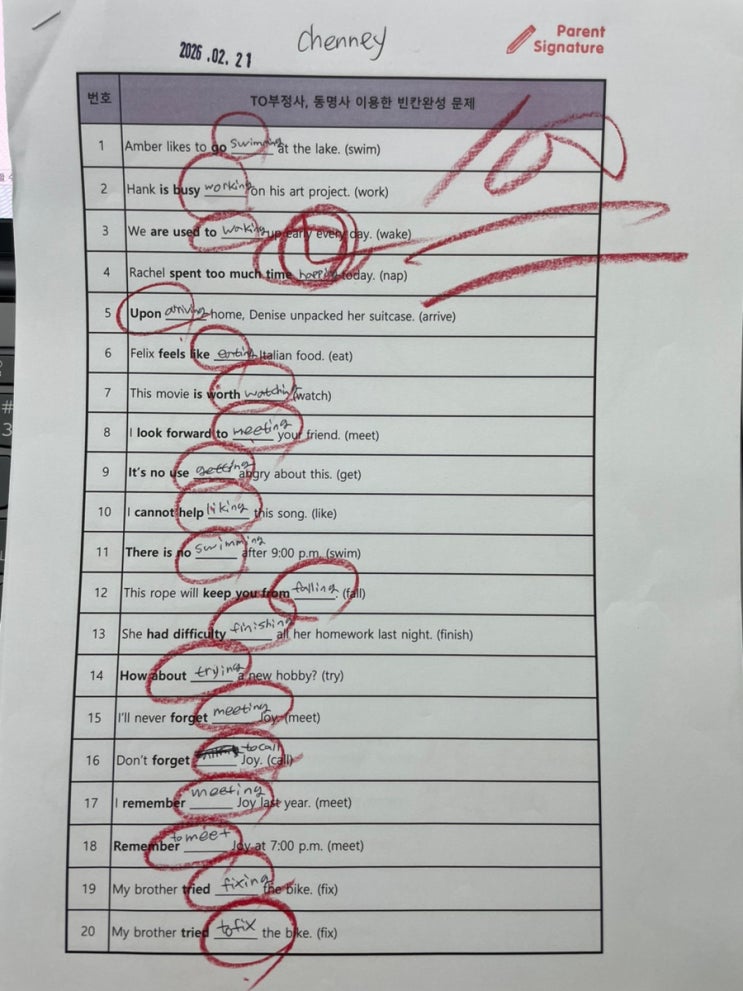 중등 내신 영어에서 동명사 vs to부정사 구분은 단골로 나옵니다. Q: 왜 동명사/to부정사 구분이 내신에서 자주 나올까? A: 중학교 내신 문법은 단순 규칙 암기보다, 동사 뒤에 목적어 형태로 무엇이 오는지(동명사/ to부정사/둘 다 가능)를 구분하는 문제가 많이 출제됩니다. 아이들이 헷갈리는 이유는 세가지로 정리해 볼 수 있습니다. (1) 동사별 패턴 암기 부족: enjoy/avoid처럼 ~ing만 되는 동사 vs decide/plan처럼 to V만 되는 동사 (2) 뜻 차이: remember/stop/try/regret 처럼 동명사·to부정사에 따라 의미가 달라지는 동사 (3) 문장 적용 부족: 규칙은 아는데 문제에서 어디를 봐야 하는지 못 찾는 상태 이 약점들을 강점으로 바꾸는....... <img src="https://blogthumb.pstatic.net/MjAyNjAyMjJfMTgx/MDAxNzcxNzM4MDk2NjE5.8oFrIvcq_Kl-xqvUrt9o6x7jnRdnVFX1vleTRJ3kIiUg.bjqOz-KOXjHm7fzoQJr2vy6rjyv3xvAgXZG8Nblm3v4g.JPEG/IMG%A3%DF8841.jpg?type=s3" />
